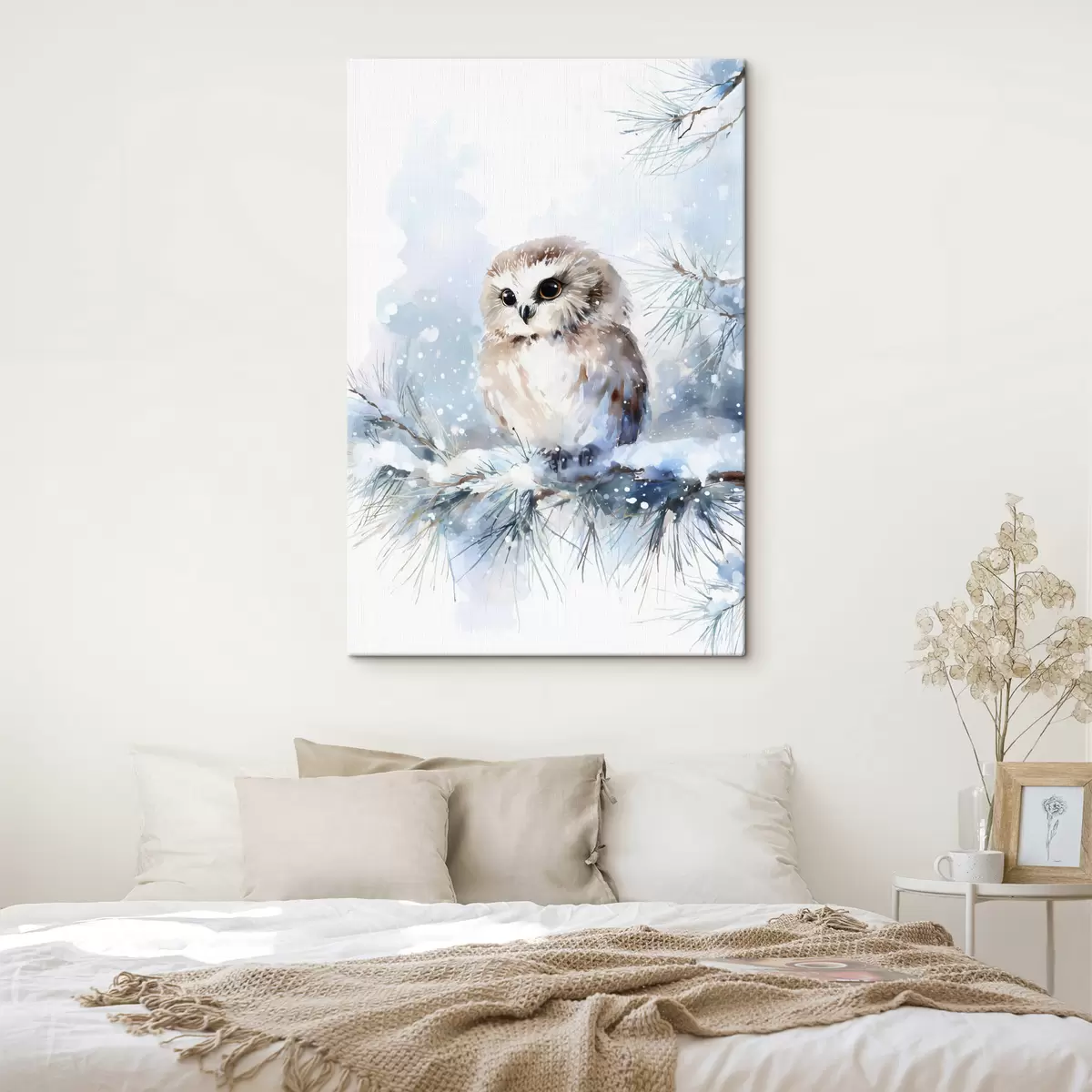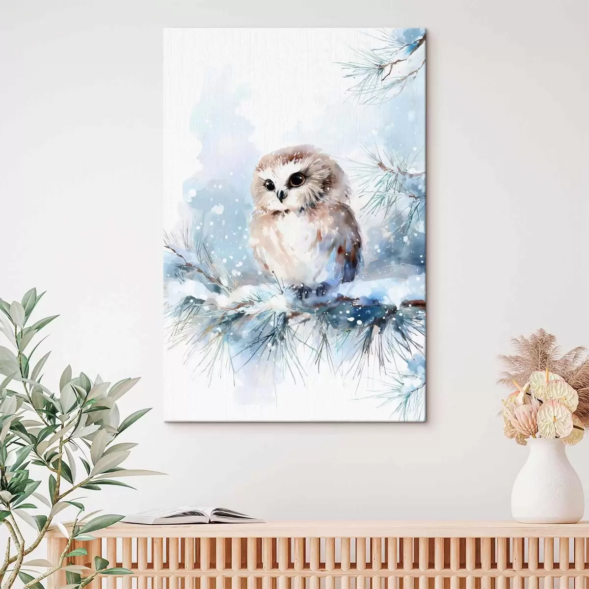 Schilderij schattige uil op een met sneeuw bedekte dennenboomtak in aquarelstijl Art. s47115