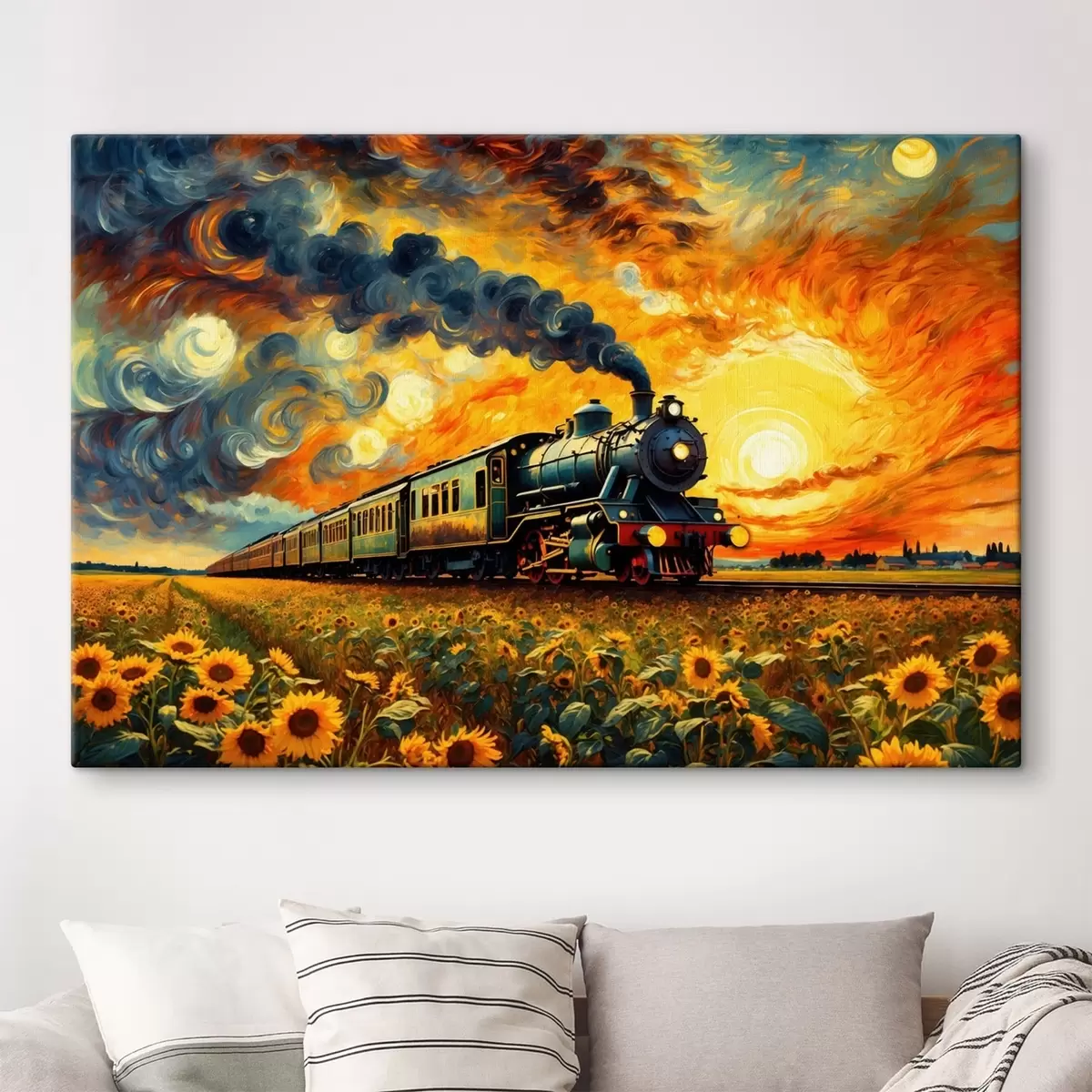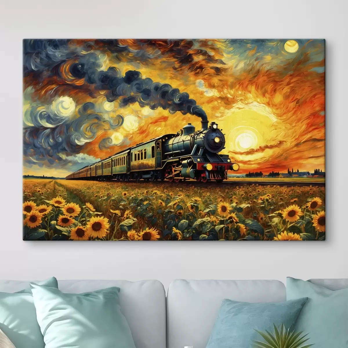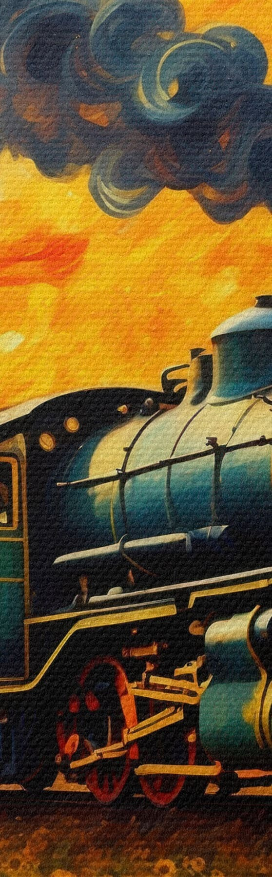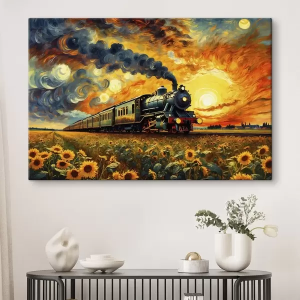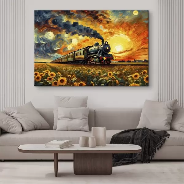 Schilderij Stoomtrein in een veld met dramatische lucht Art. s47257
