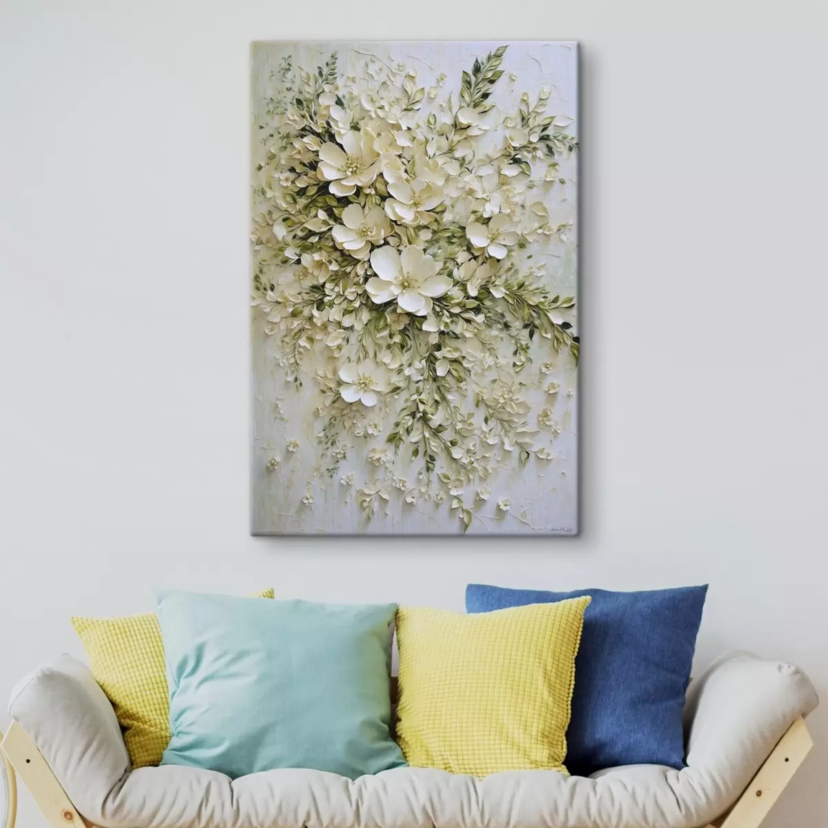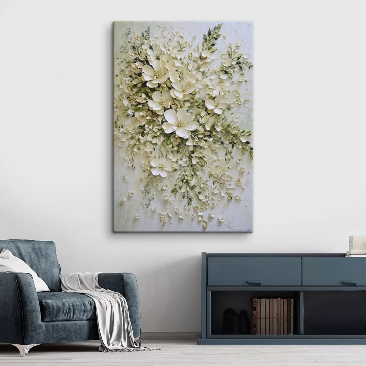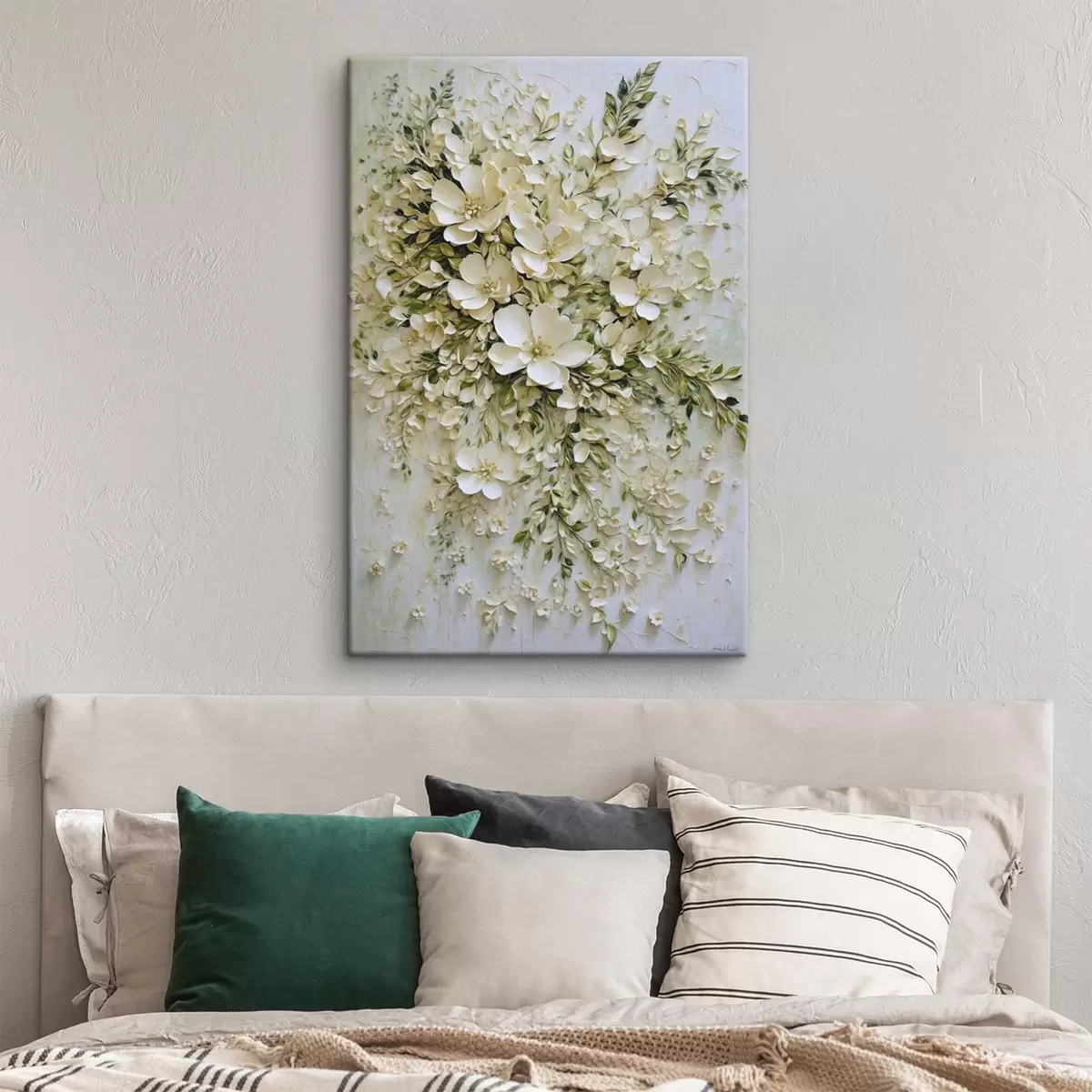 Schilderij Grote compositie van crèmekleurige bloemen en bladeren Art. s47267