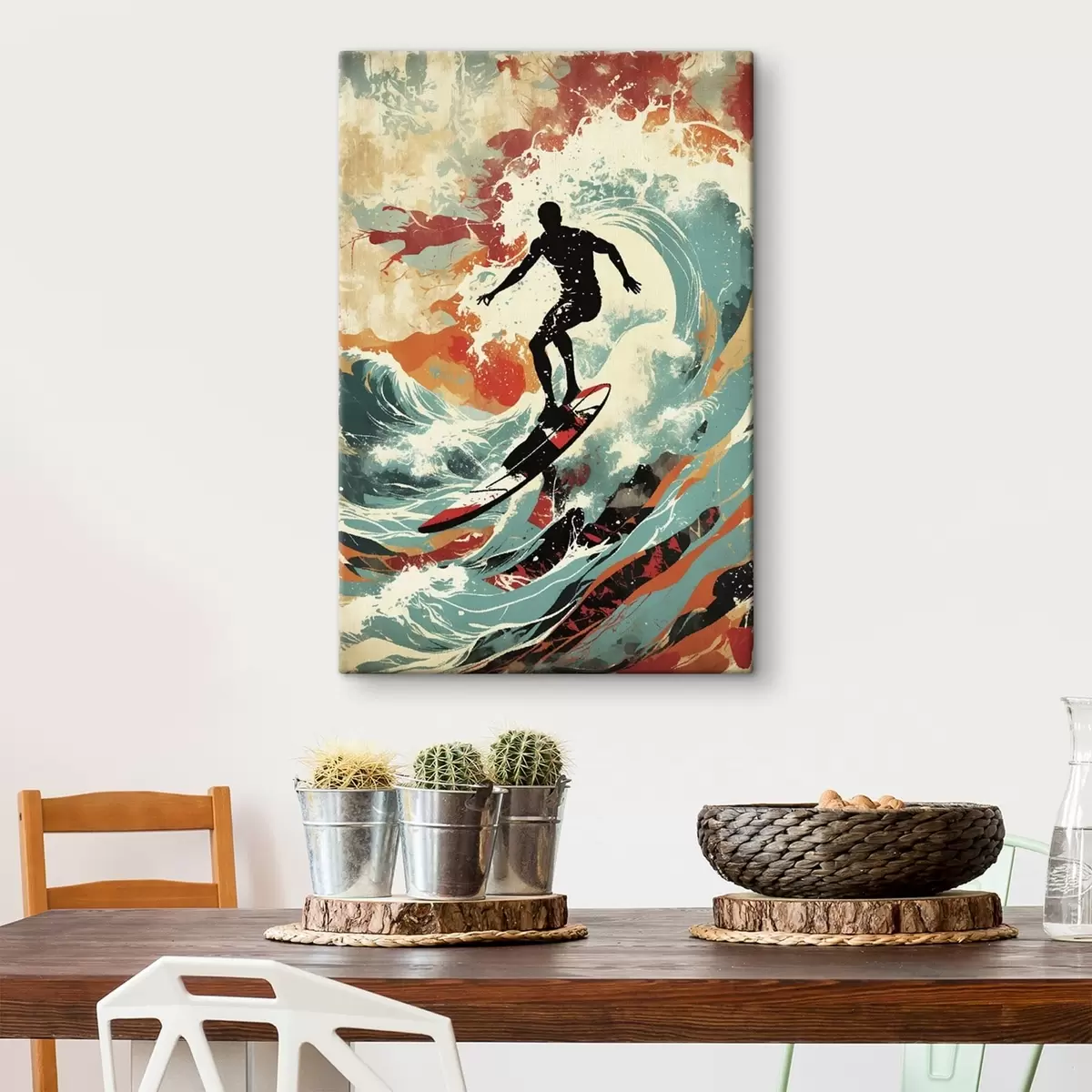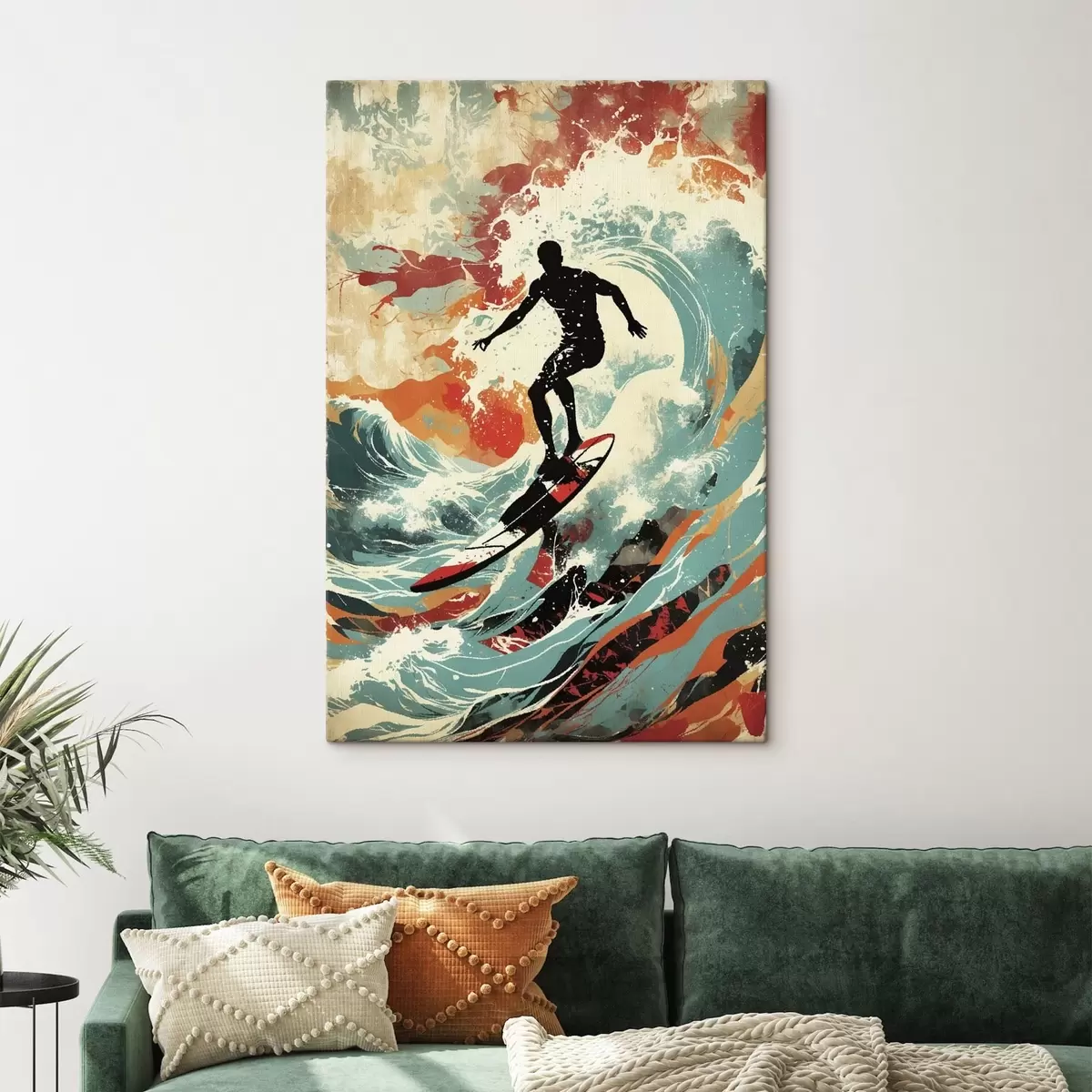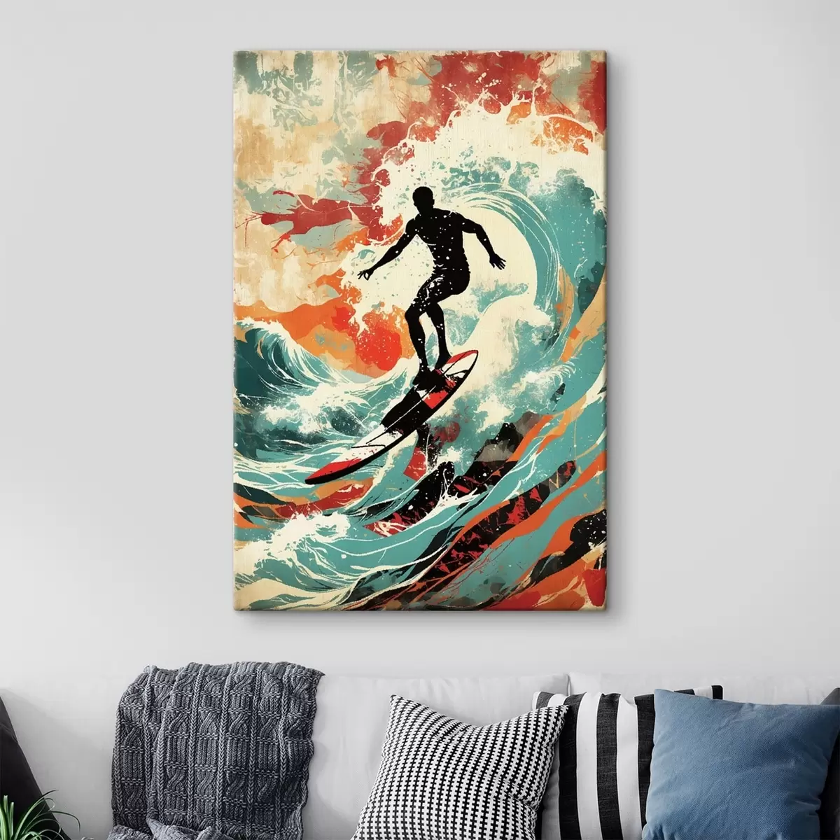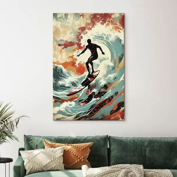 Schilderij Surfer silhouet op golven in levendige kleuren Art. s47284