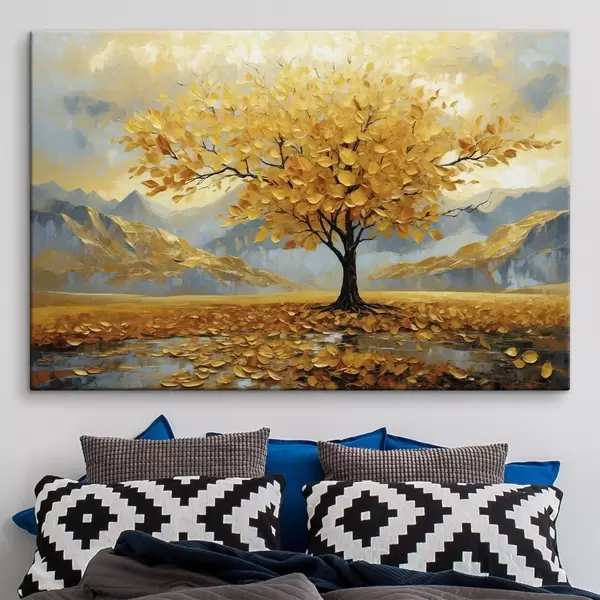Schilderijen Boom met gele bladeren in een berglandschap s47285
