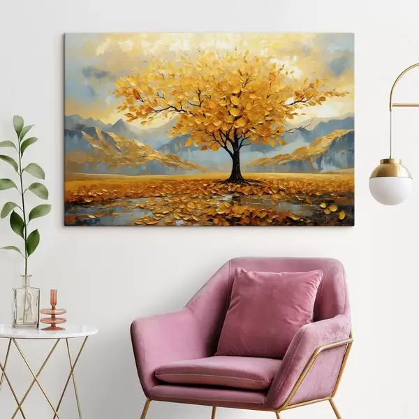 Schilderijen Boom met gele bladeren in een berglandschap s47285