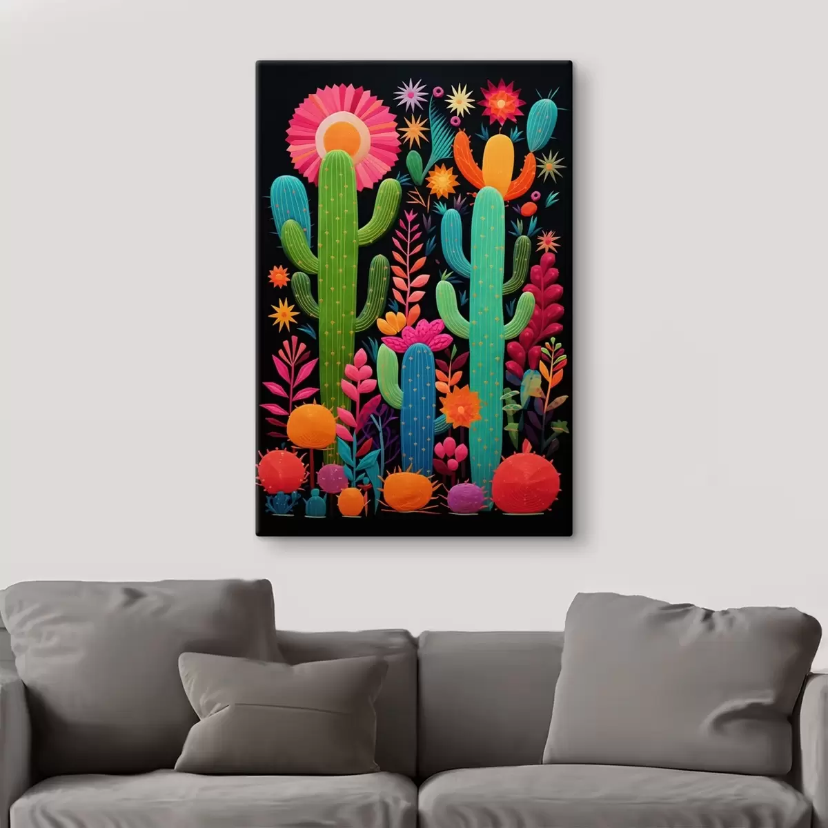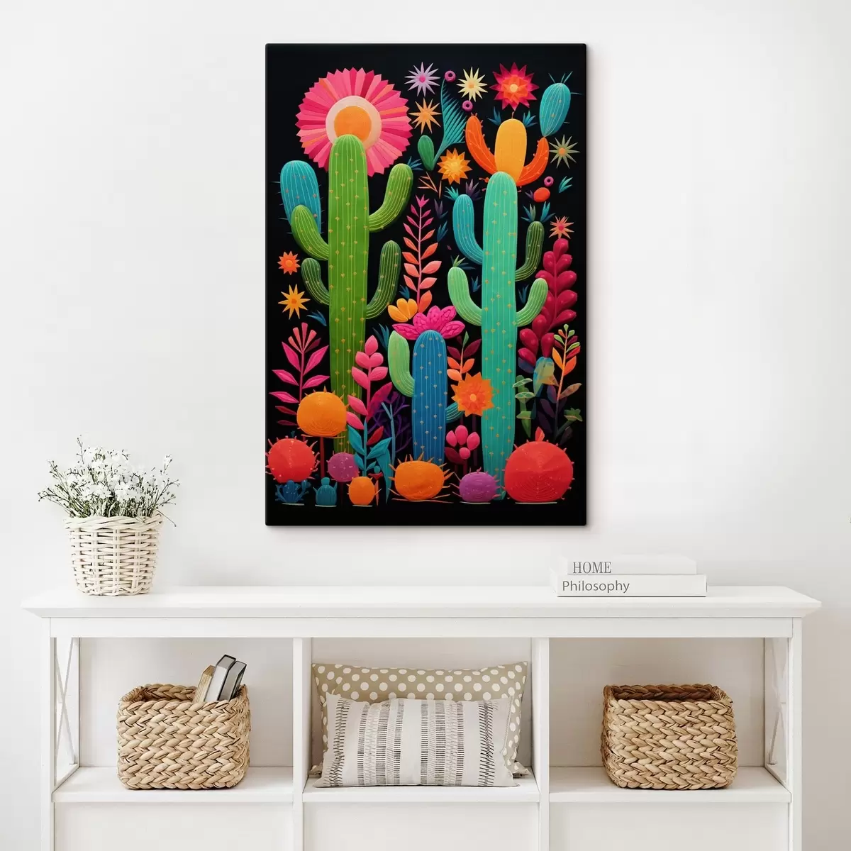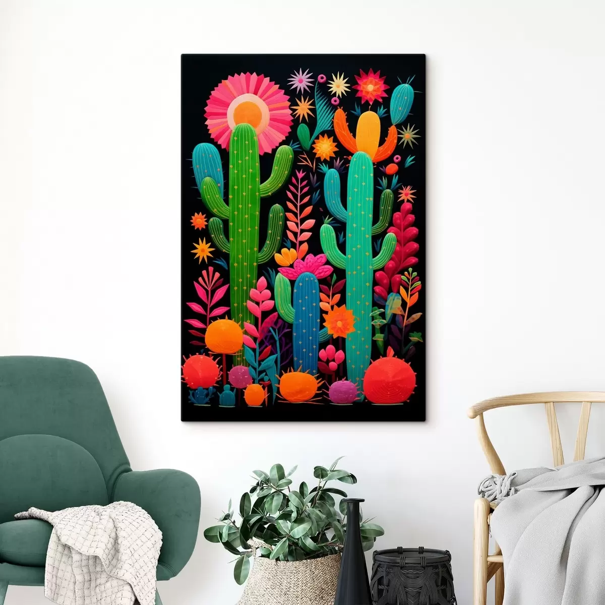 Schilderij Levendige cactussen en bloemen op donkere achtergrond Art. s47297