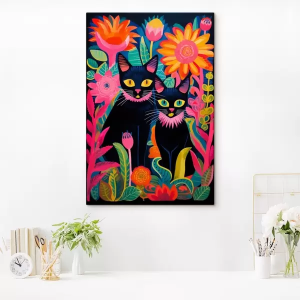 Schilderij Twee zwarte katten tussen heldere bloemen Art. s47299