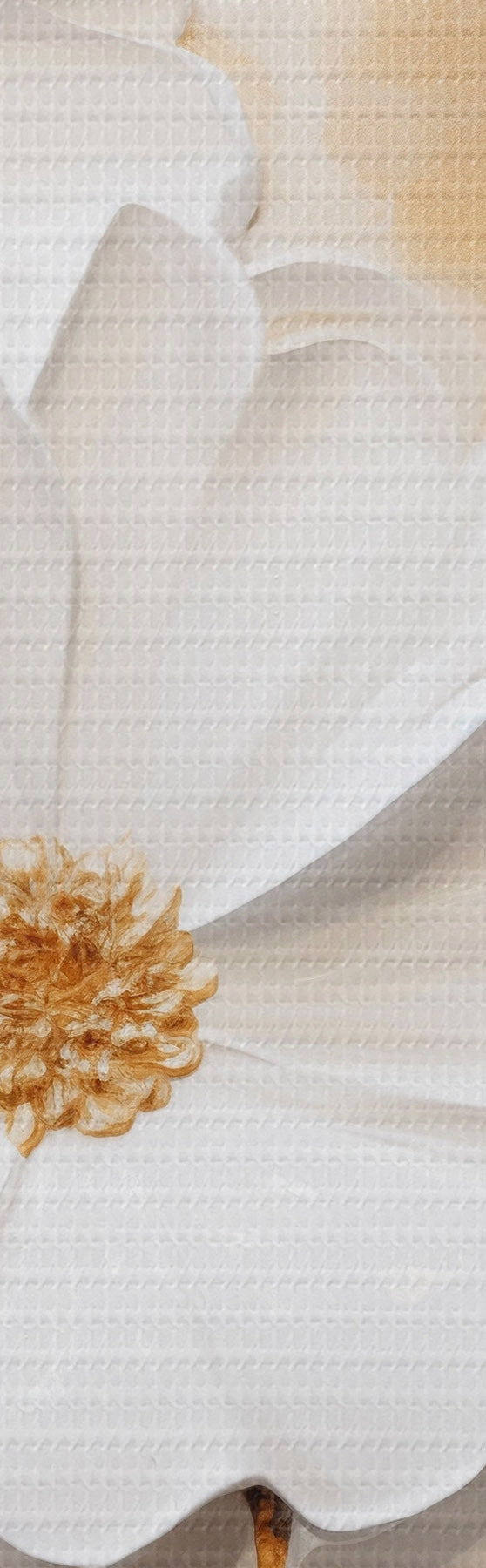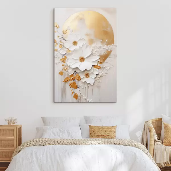 Schilderijen Witte bloemen met gele accenten en delicate bladeren tegen een gestructureerde achtergrond, moderne kunst s47414