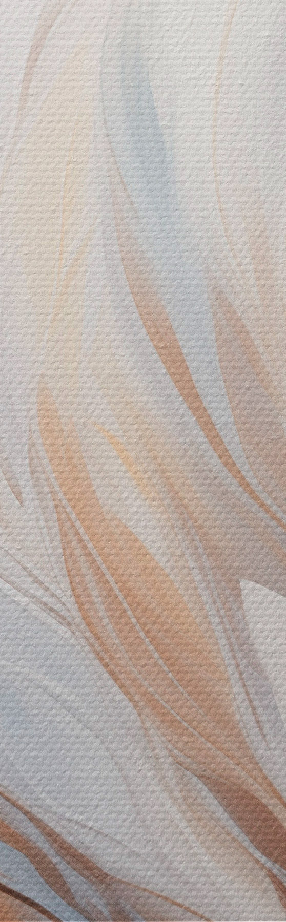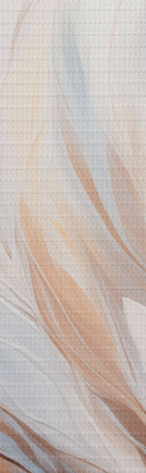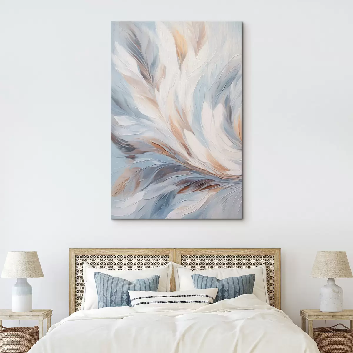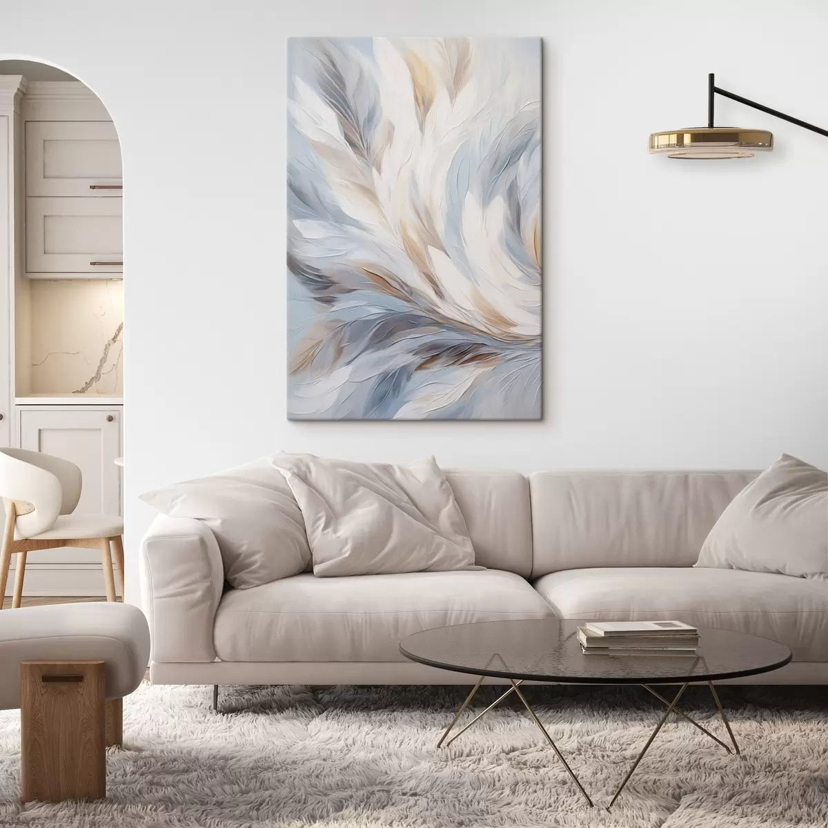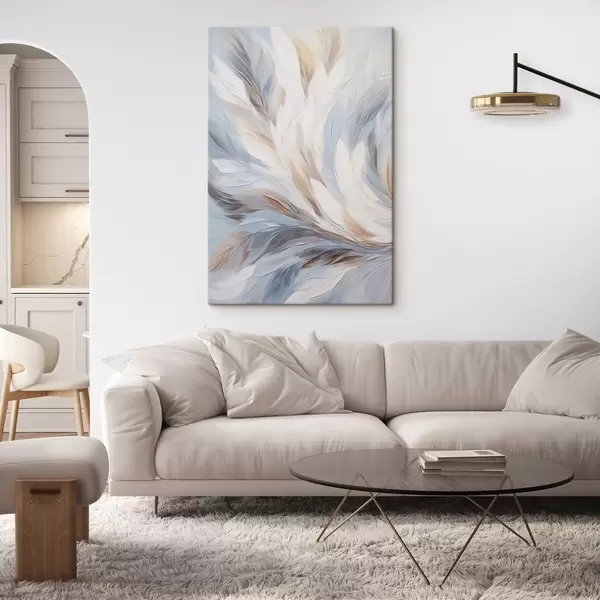 Schilderij Abstract schilderij van veren in tinten wit, blauw en bruin, met een zachte, vloeiende textuur en een lichte achtergrond. Art. s47417