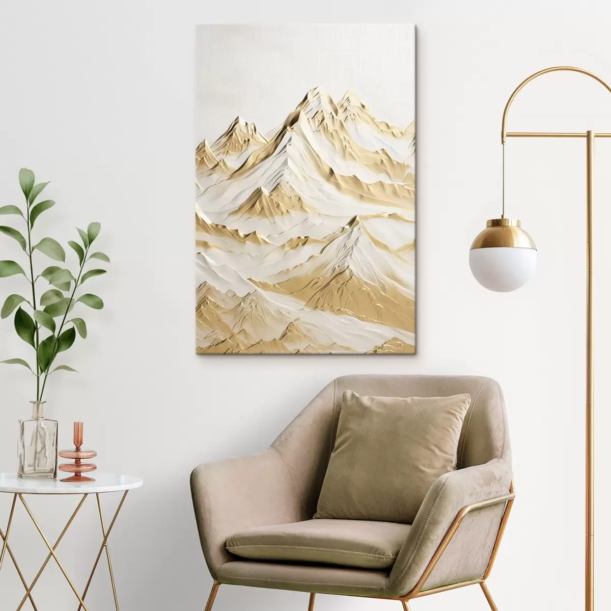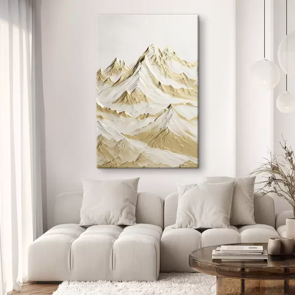 Schilderij Een landschap van gele, met sneeuw bedekte bergen met scherpe toppen en diepe valleien onder een heldere hemel. Art. s47420