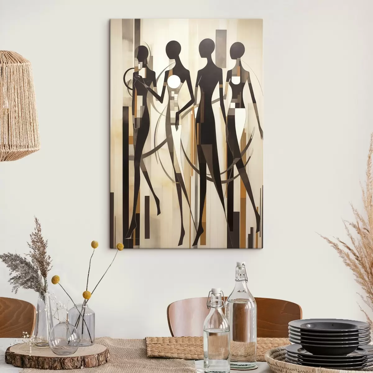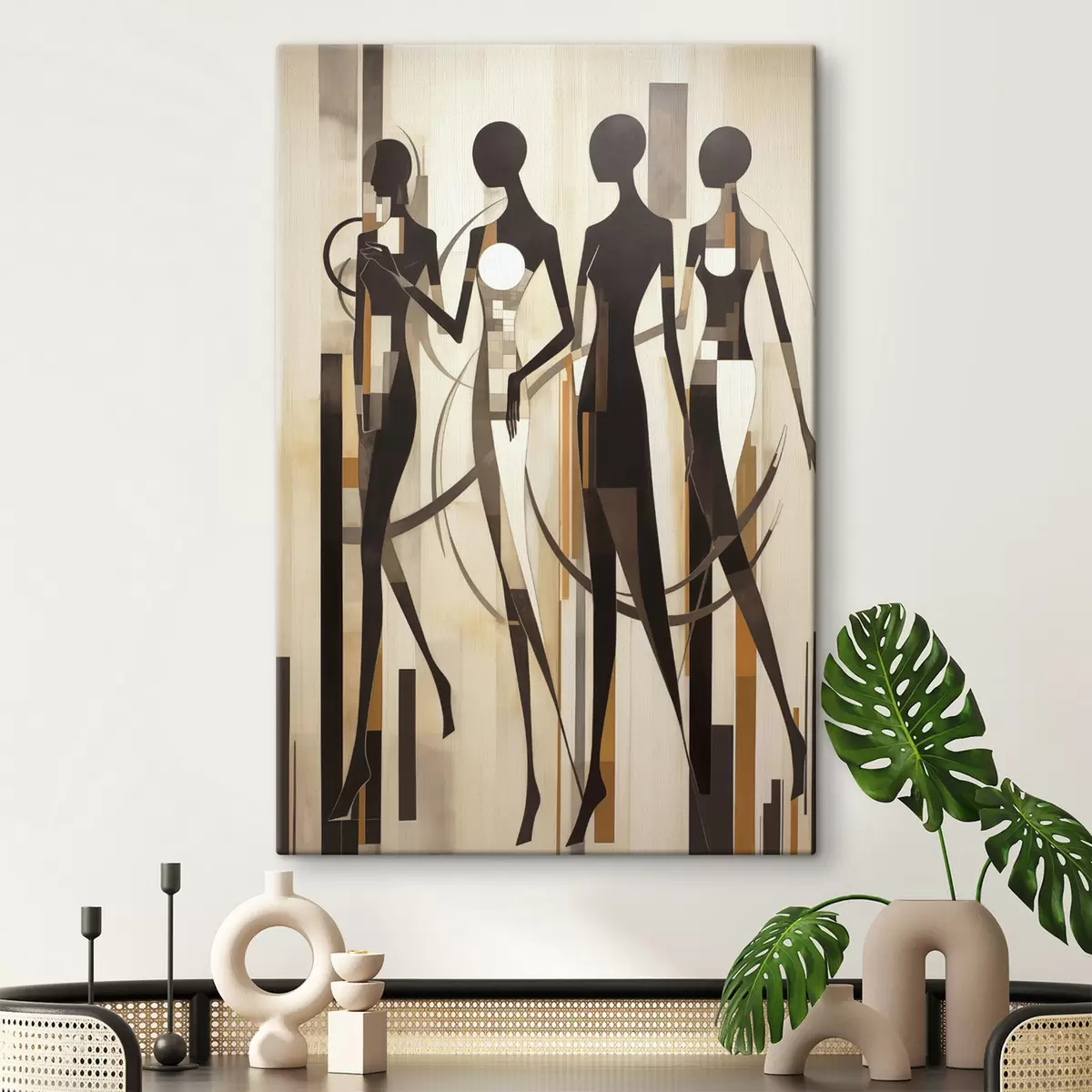 Schilderij Gestileerde vrouwelijke figuren met geometrische elementen tegen een abstracte achtergrond van verticale lijnen Art. s47423