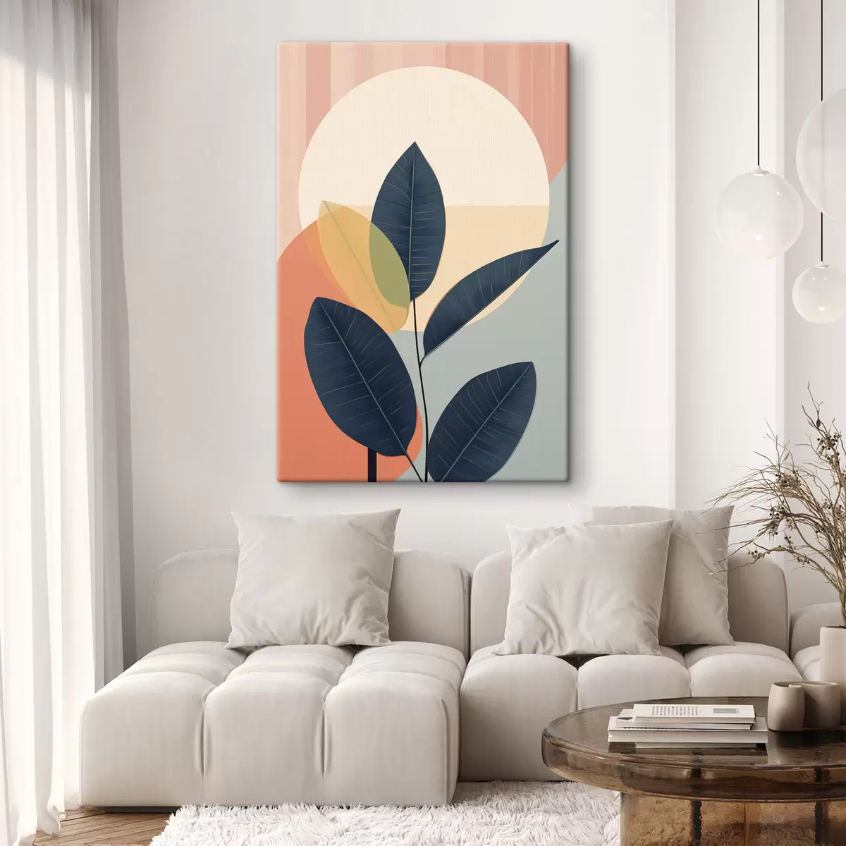 Schilderijen Donkere bladeren tegen een achtergrond van abstracte vormen in perzik en grijs met een grote, lichtgele cirkel s47424