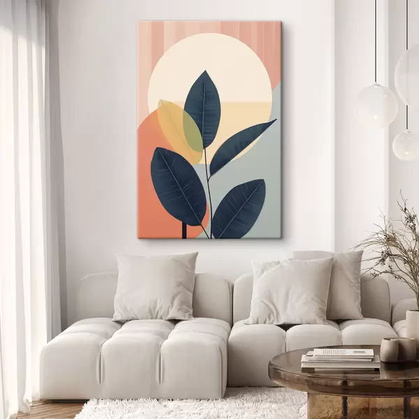 Schilderij Donkere bladeren tegen een achtergrond van abstracte vormen in perzik en grijs met een grote, lichtgele cirkel Art. s47424
