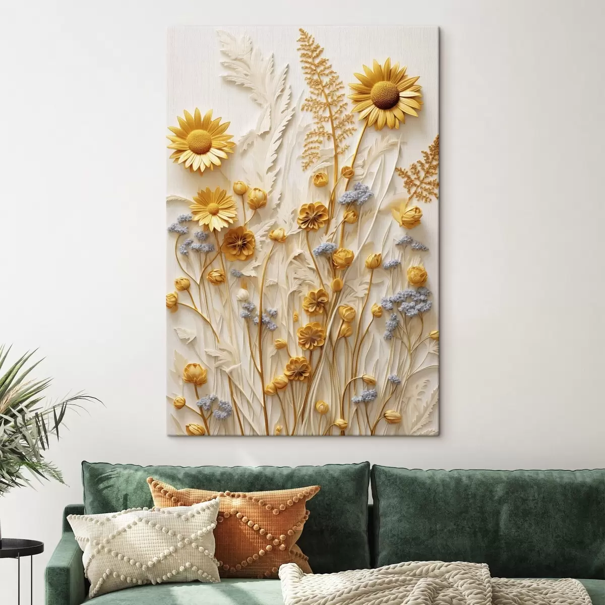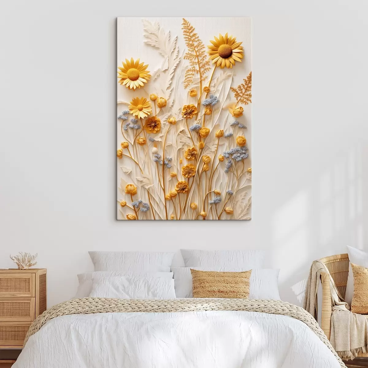 Schilderij Een collectie met textuur van gele en witte madeliefjes met gedroogde grassen en lavendeltakjes op een witte achtergrond Art. s47431
