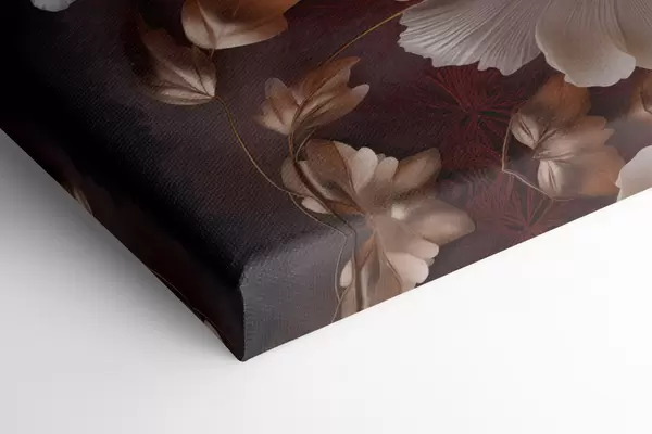 Schilderij Delicate pioenrozen met dunne, ijle bloemblaadjes, omgeven door donkerrode en gele bladeren tegen een abstracte achtergrond Art. s47435