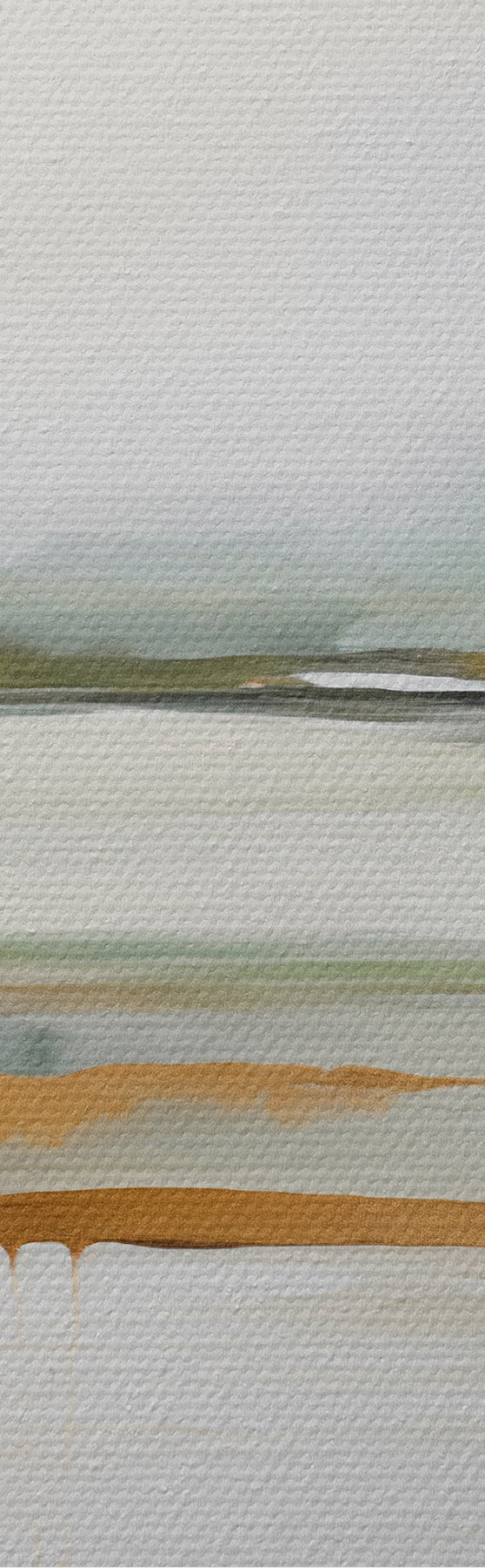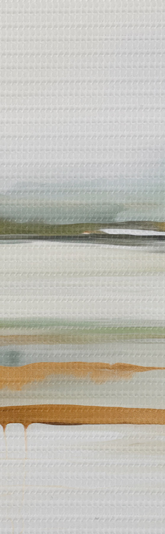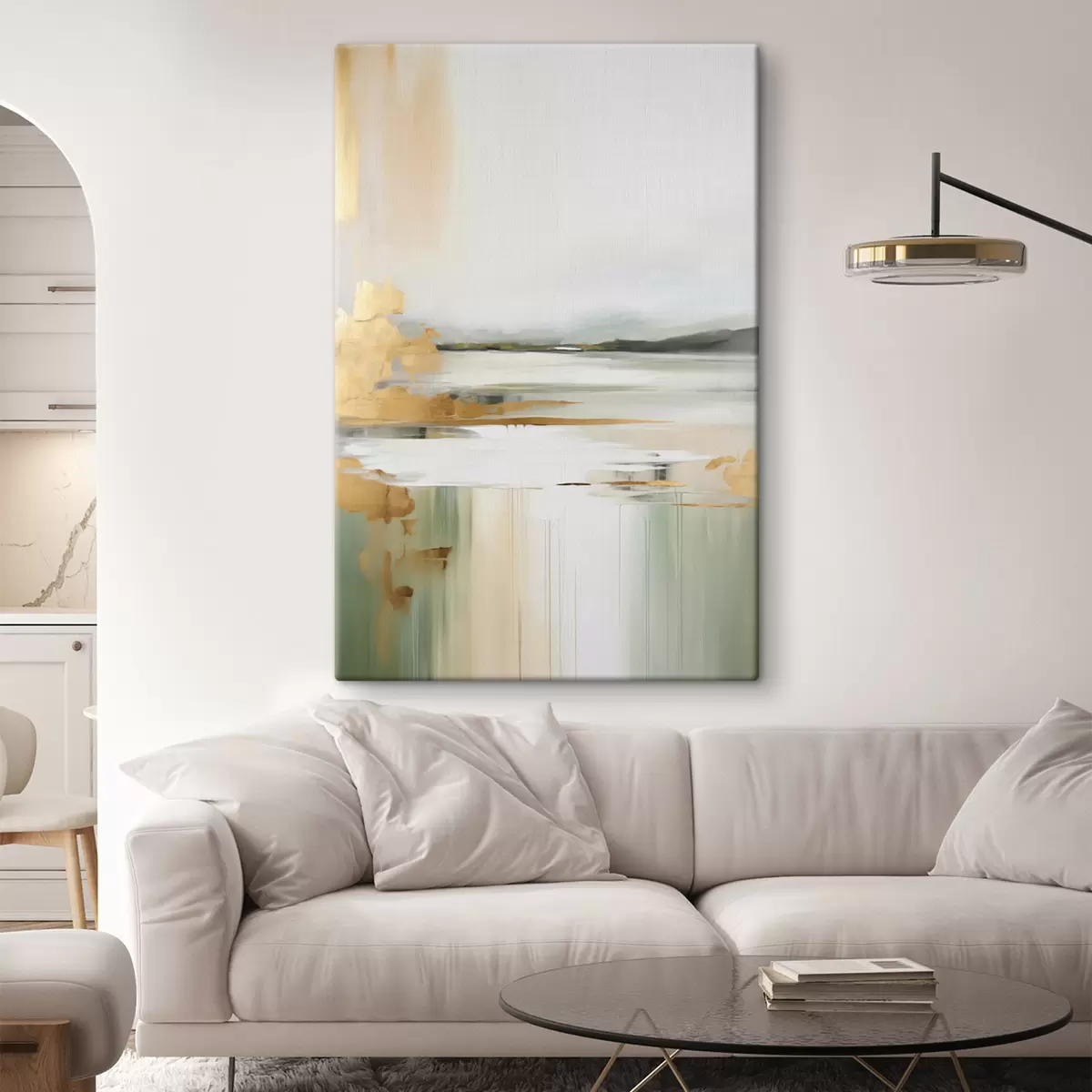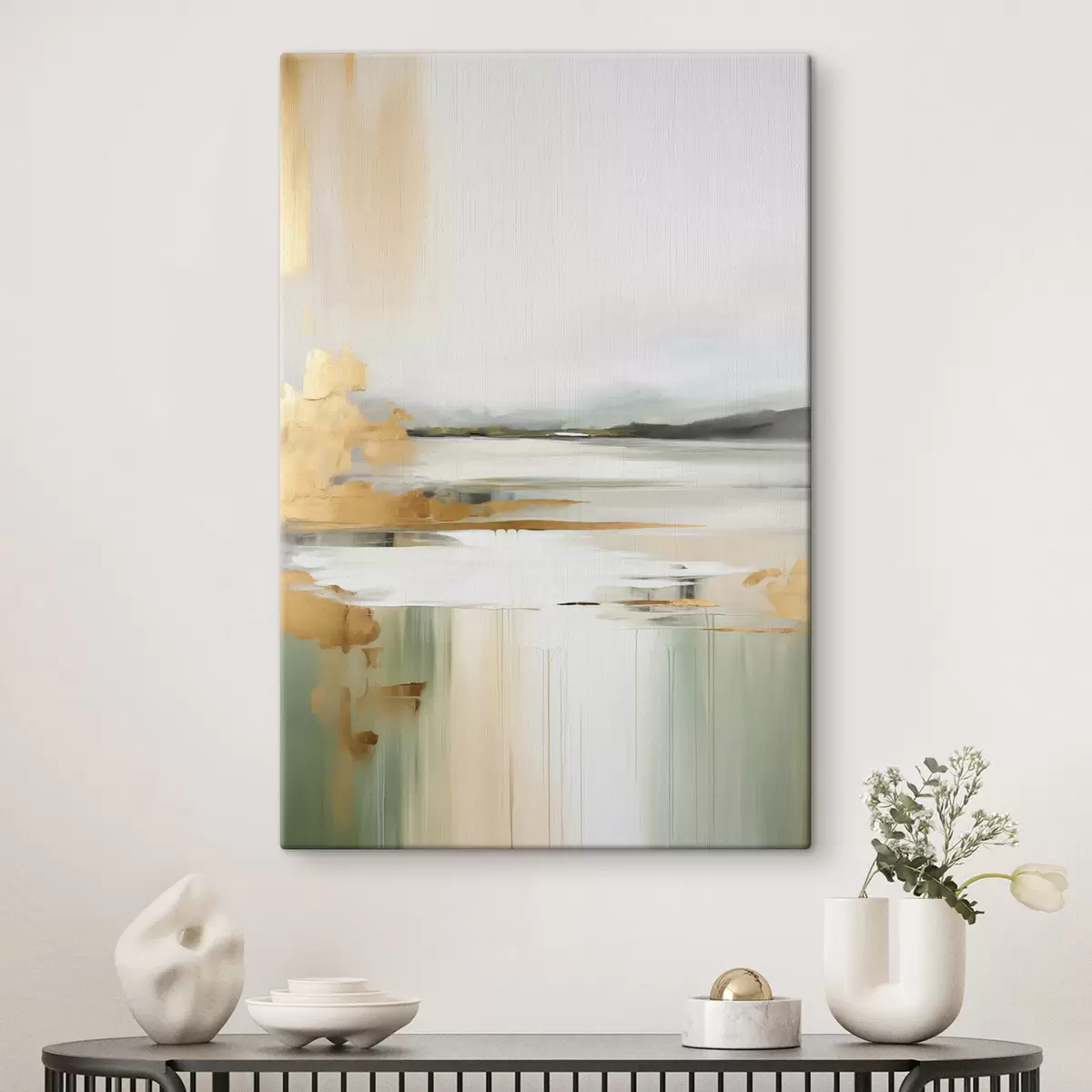 Schilderij Abstract landschap met gele en groene tinten, water dat de lucht en verre bergen weerspiegelt, bleke, wazige lucht Art. s47438
