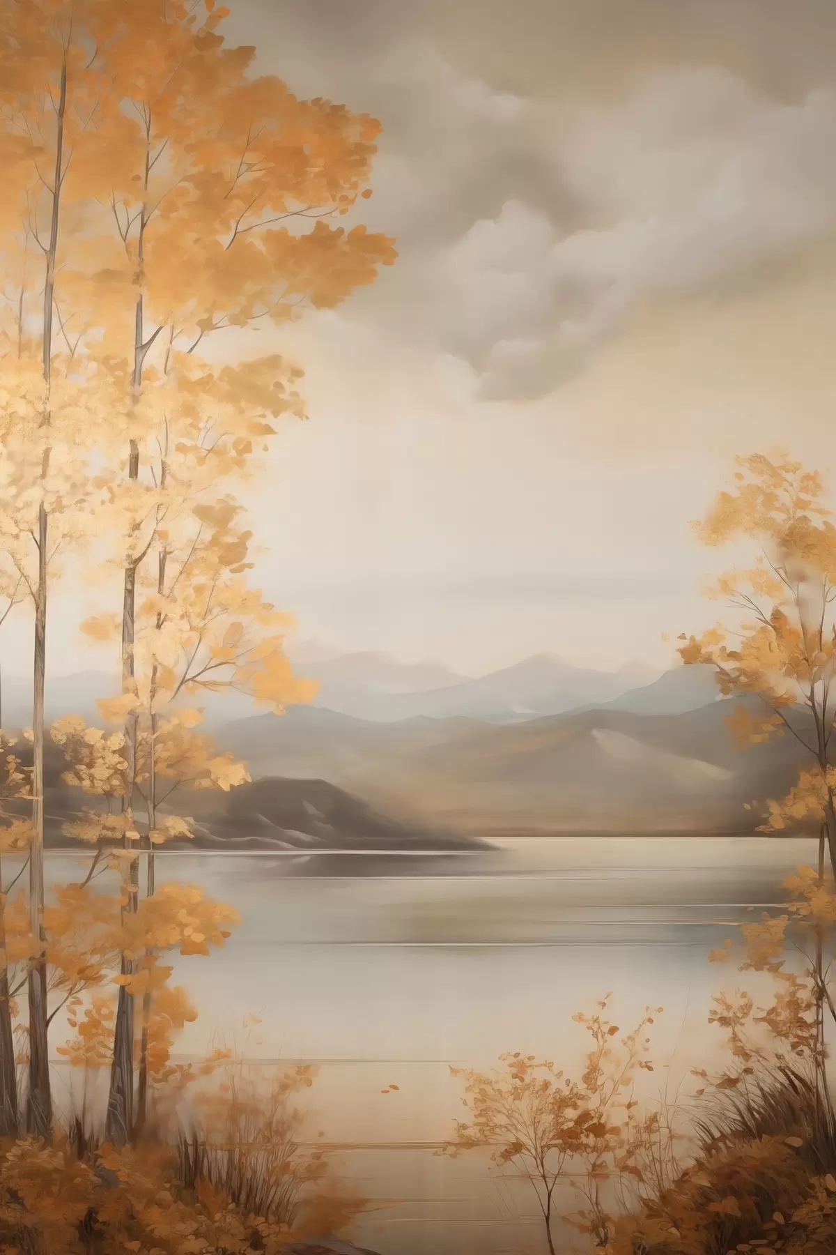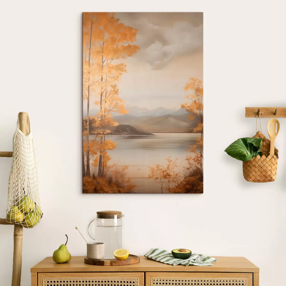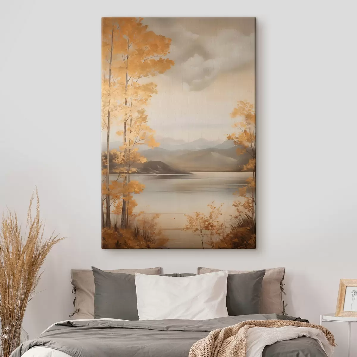 Schilderij Herfstbomen met oranje bladeren omlijsten een rustig meer met bergen in de verte onder een bewolkte hemel. Art. s47441