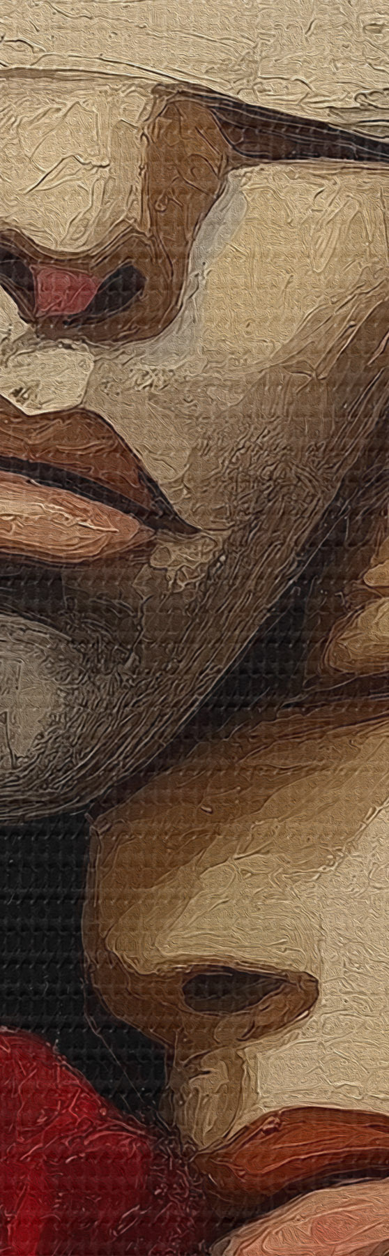 Het schilderij kan voorzichtig worden schoongeveegd met een droge zachte doek of spons; het wordt niet aanbevolen om natte producten te gebruiken. Het gebruik van een vochtige spons is alleen toegestaan als het schilderij gevernist is.