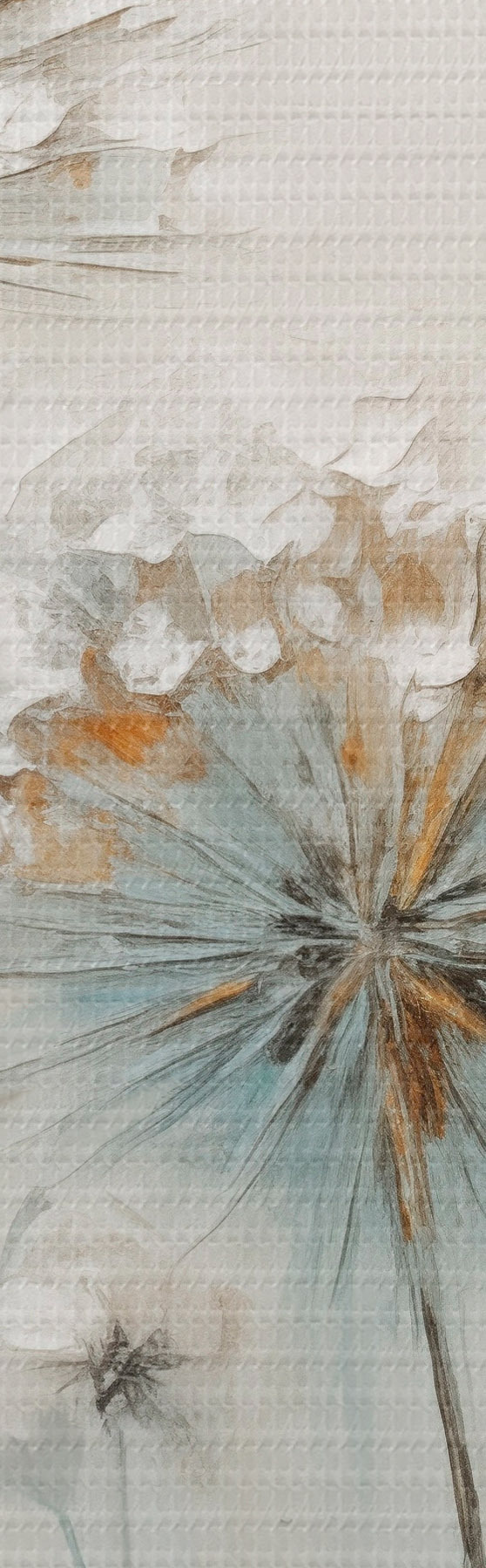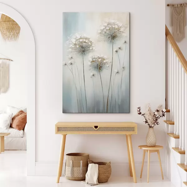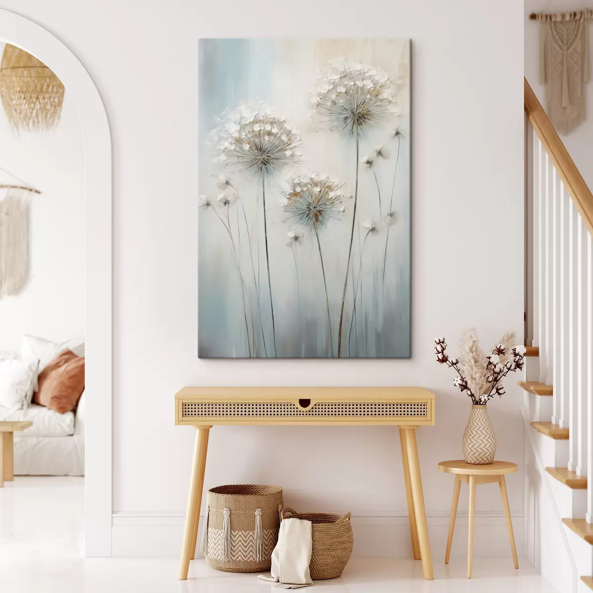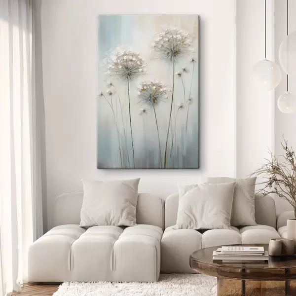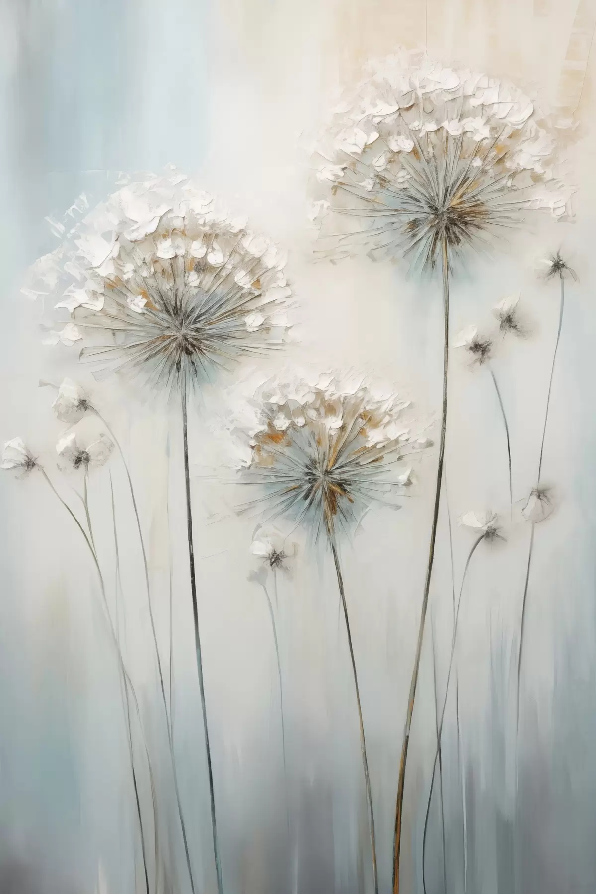Schilderij Textuurrijke schilderstijl van paardenbloemen tegen een zachte blauw-witte achtergrond Art. s47855