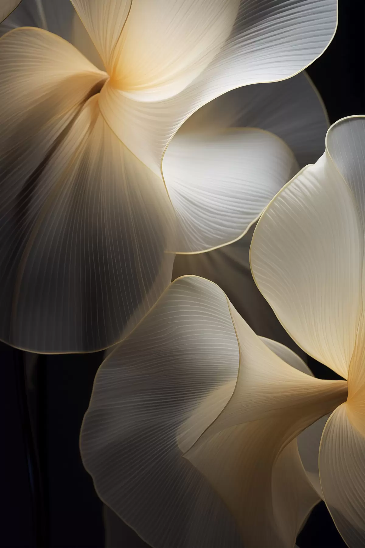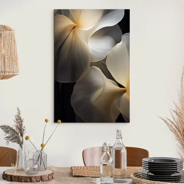 Schilderij Abstracte, vloeiende, doorschijnende bloemblaadjes met delicate lijnen, tegen een donkere achtergrond Art. s47859