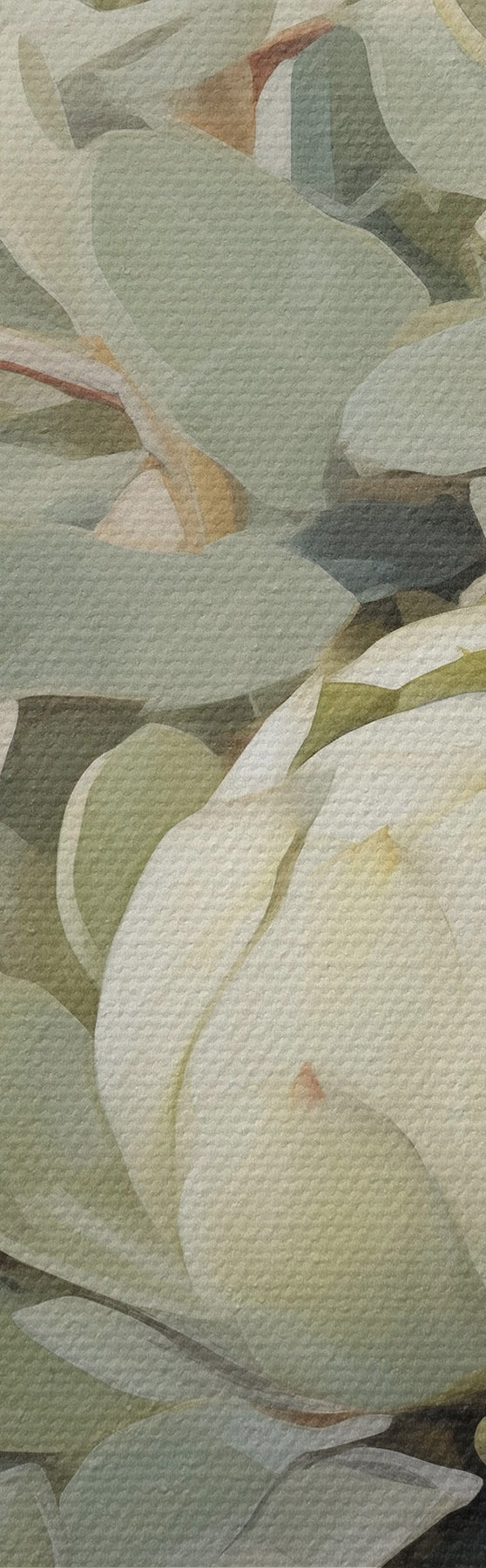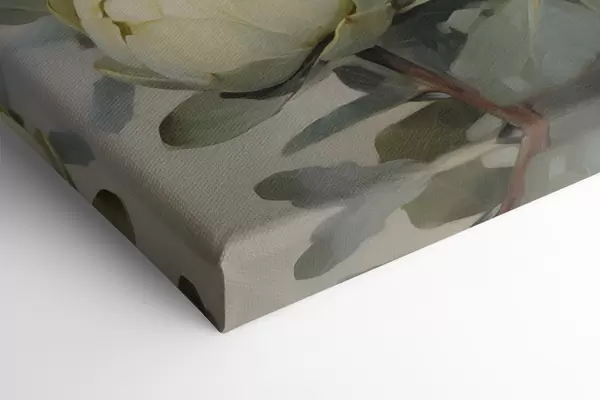 Schilderij Schilderstijl van verschillende witte proteabloemen met grote groene bladeren tegen een lichte achtergrond Art. s47861