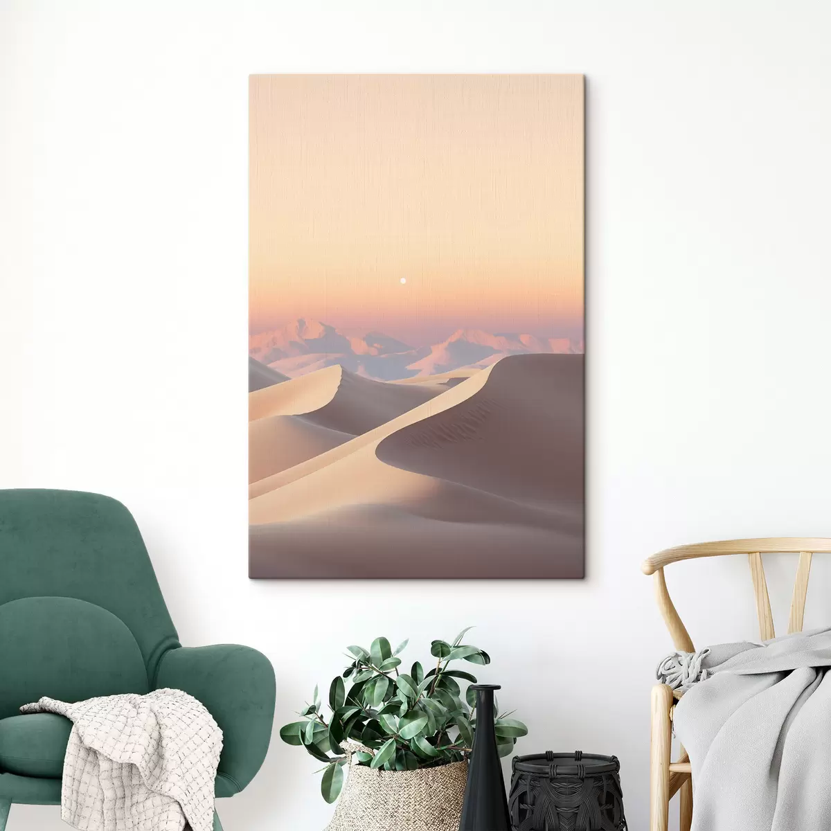 Schilderij Een woestijnlandschap met glooiende zandduinen onder een zachte pastelkleurige lucht, met in de verte bergen op de achtergrond. Art. s47865