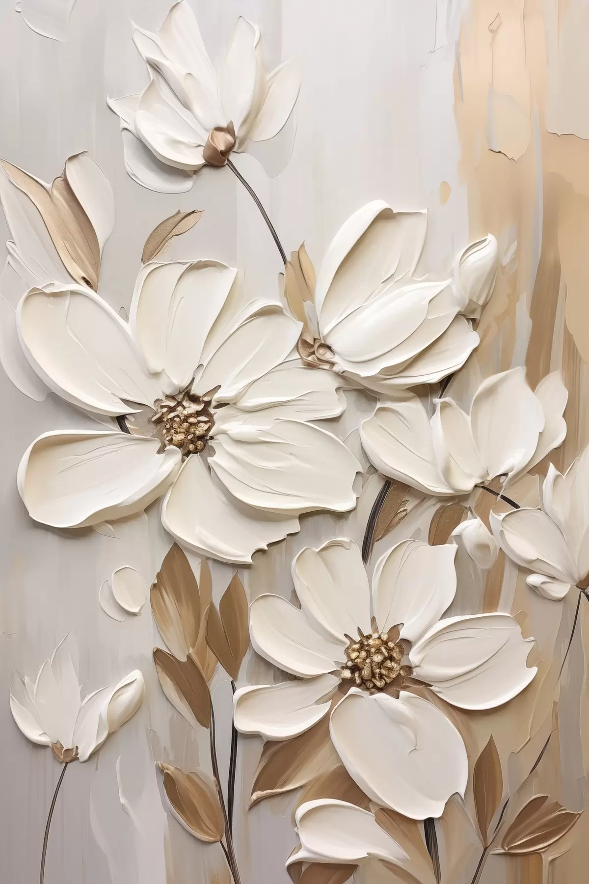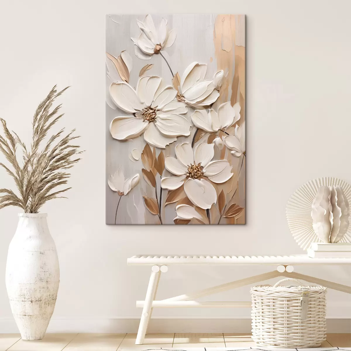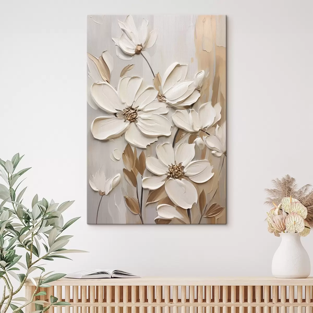 Schilderij Abstracte witte bloemen met gestructureerde bloemblaadjes, tegen een neutrale achtergrond met subtiele penseelstreken. imitatie Art. s47873