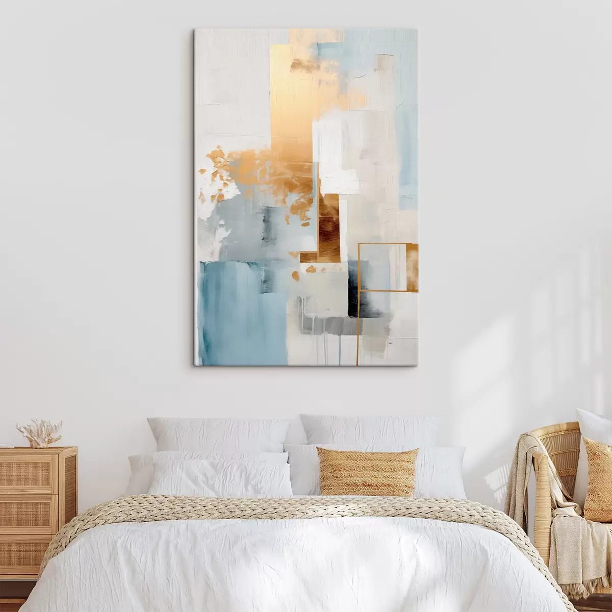 Schilderijen Abstracte geometrische vormen in geel, blauw en wit, met textuur en een minimalistische compositie. s47881