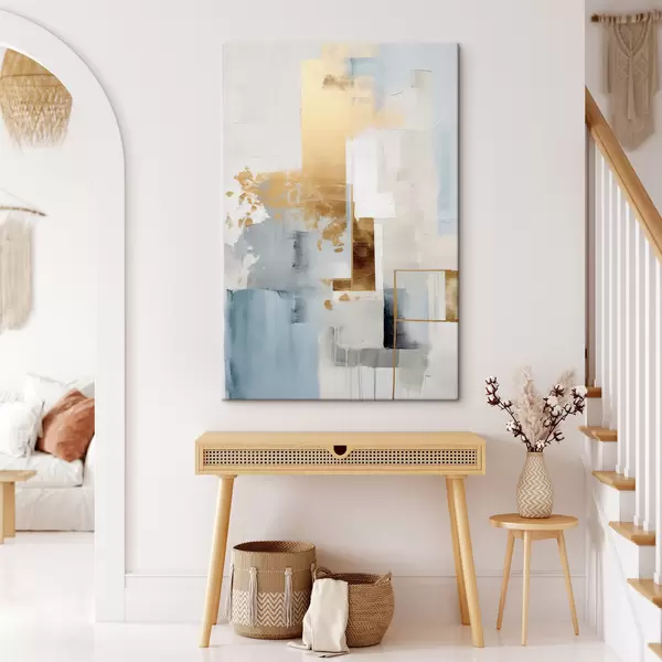 Schilderij Abstracte geometrische vormen in geel, blauw en wit, met textuur en een minimalistische compositie. Art. s47881