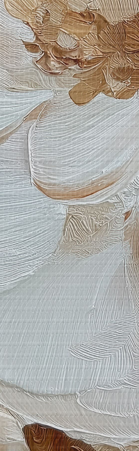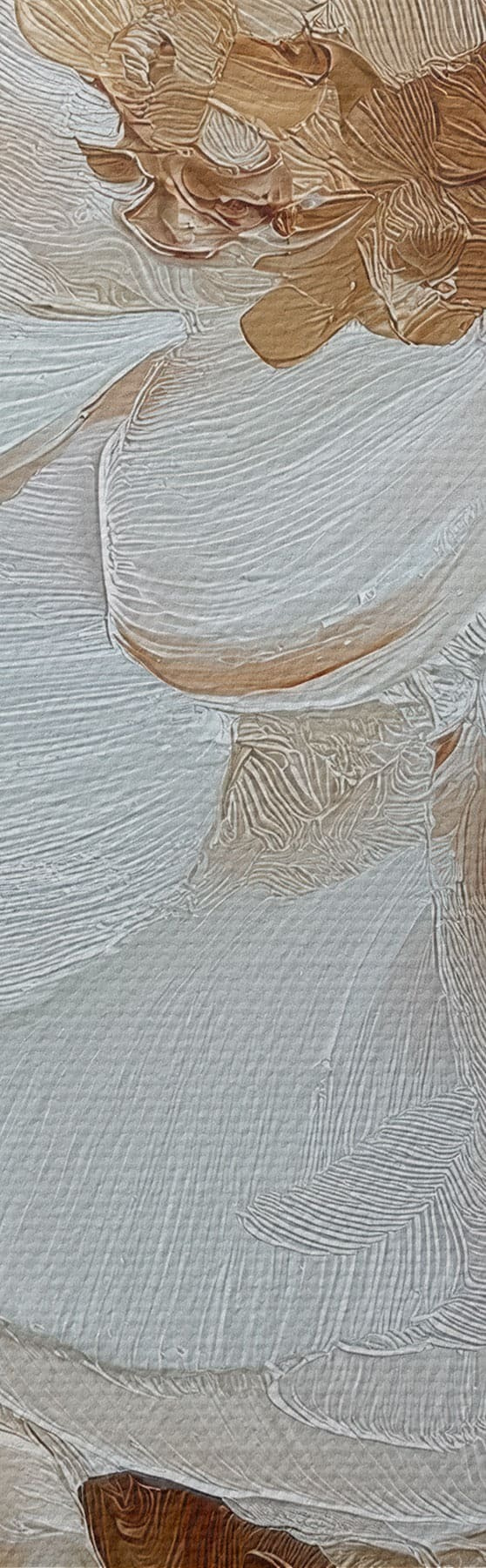 Het schilderij kan voorzichtig worden schoongeveegd met een droge zachte doek of spons; het wordt niet aanbevolen om natte producten te gebruiken. Het gebruik van een vochtige spons is alleen toegestaan als het schilderij gevernist is.