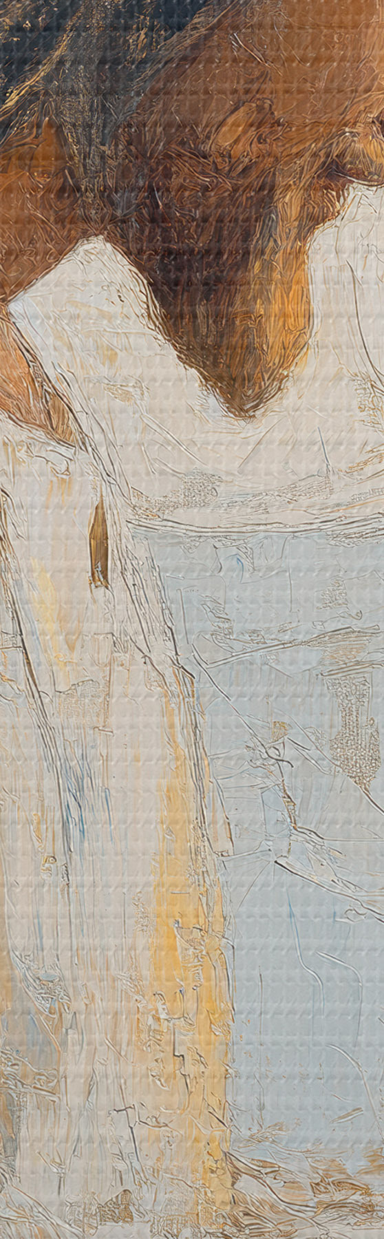 Het schilderij kan voorzichtig worden schoongeveegd met een droge zachte doek of spons; het wordt niet aanbevolen om natte producten te gebruiken. Het gebruik van een vochtige spons is alleen toegestaan als het schilderij gevernist is.
