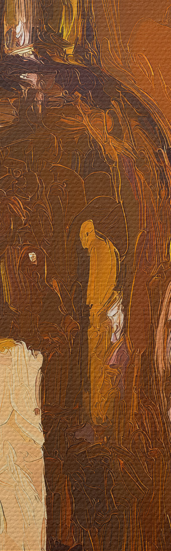 Het schilderij kan voorzichtig worden schoongeveegd met een droge zachte doek of spons; het wordt niet aanbevolen om natte producten te gebruiken. Het gebruik van een vochtige spons is alleen toegestaan als het schilderij gevernist is.