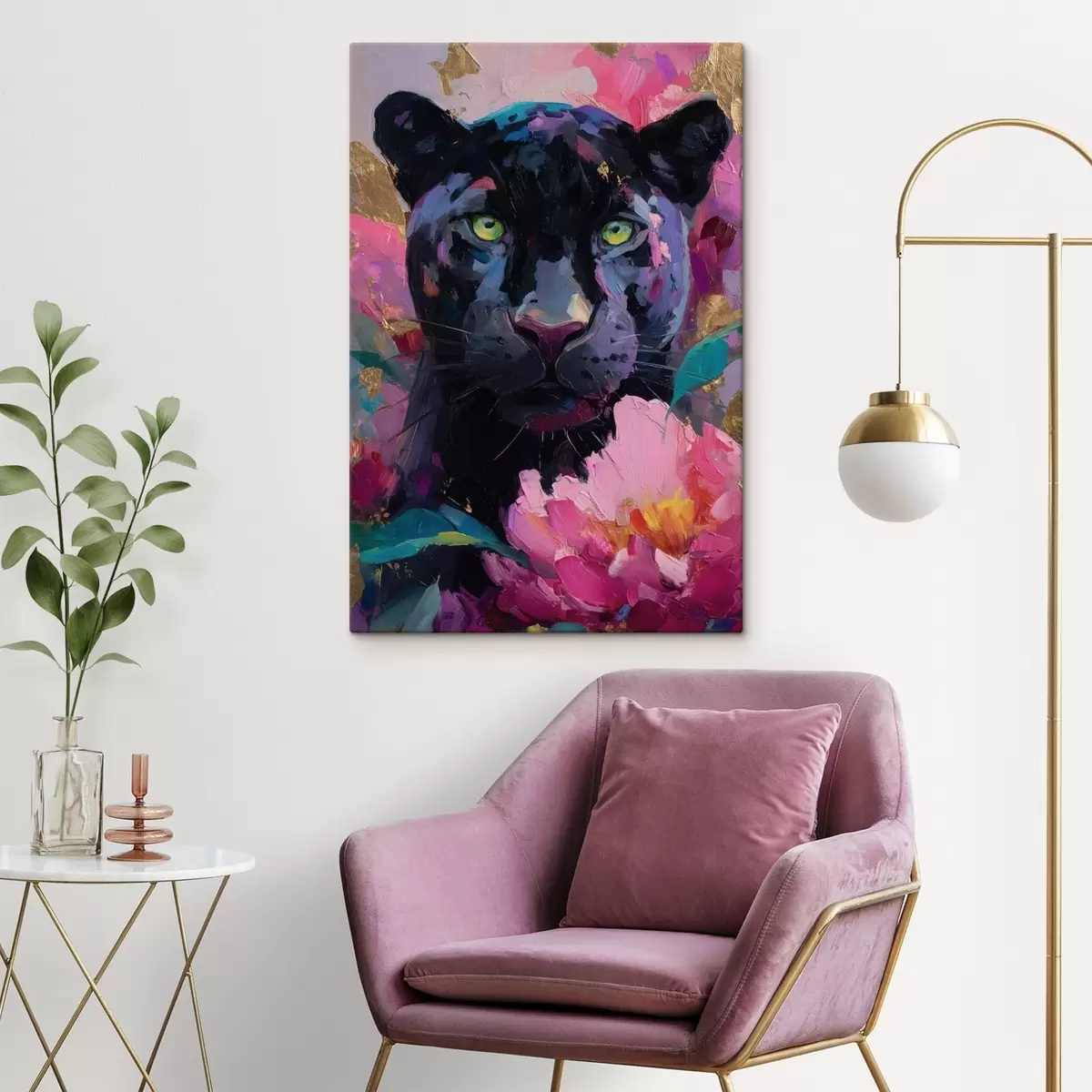 Schilderij zwarte panter tussen pioenrozen Art. s47935