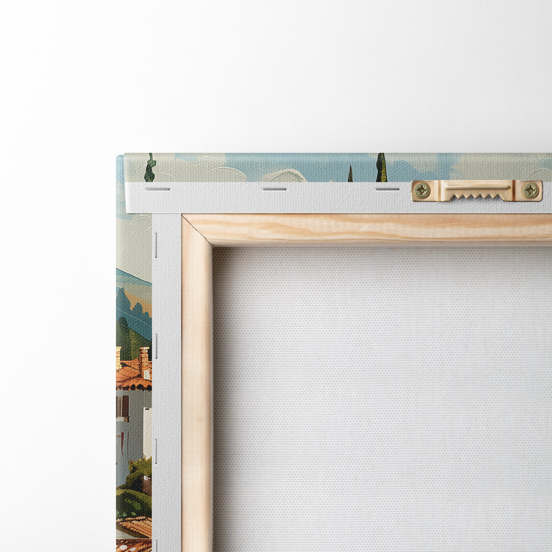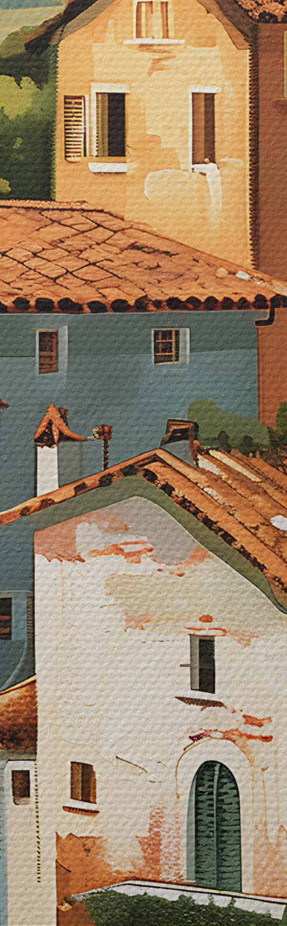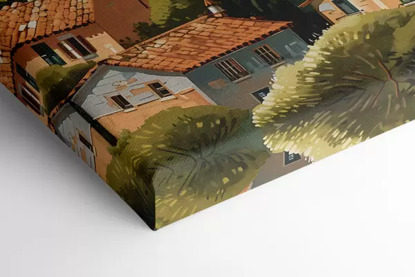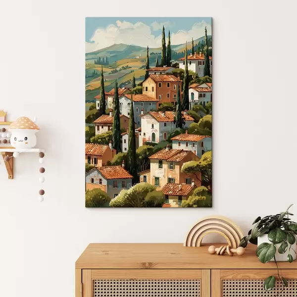 Schilderij mediterraan dorpje op een heuvel, met warmgekleurde huizen met terracotta daken Art. s47951