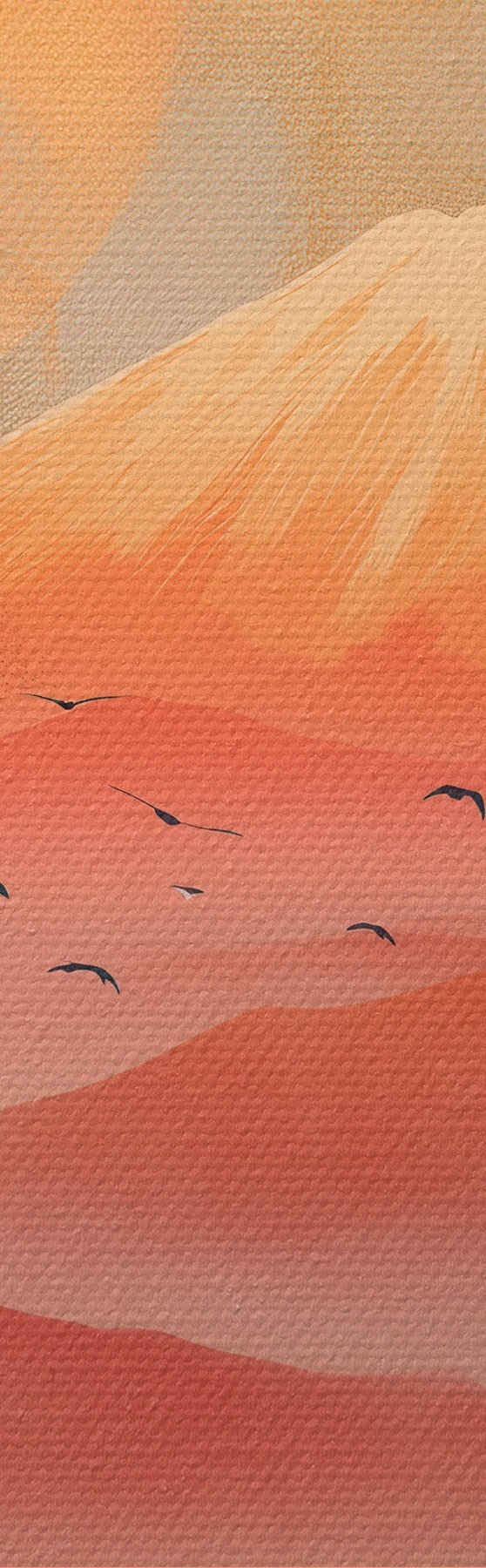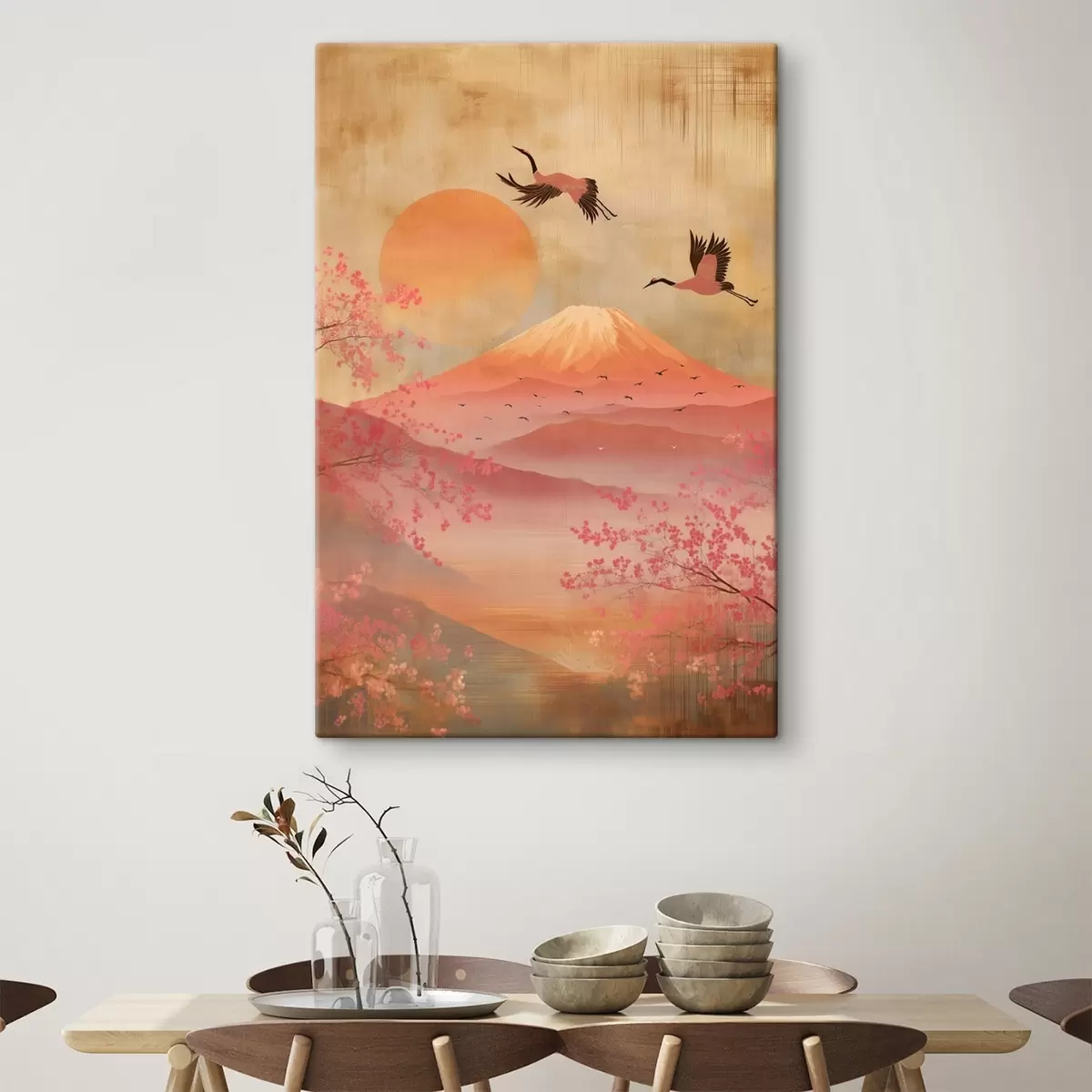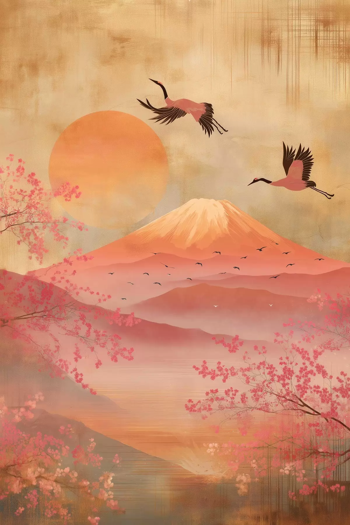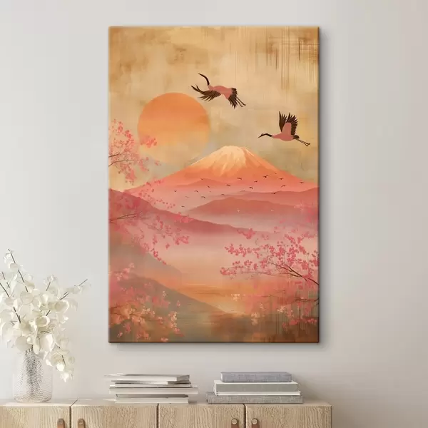 Schilderijen Kranen tegen de zon en bergen: illustratie in digitale kunststijl s47992