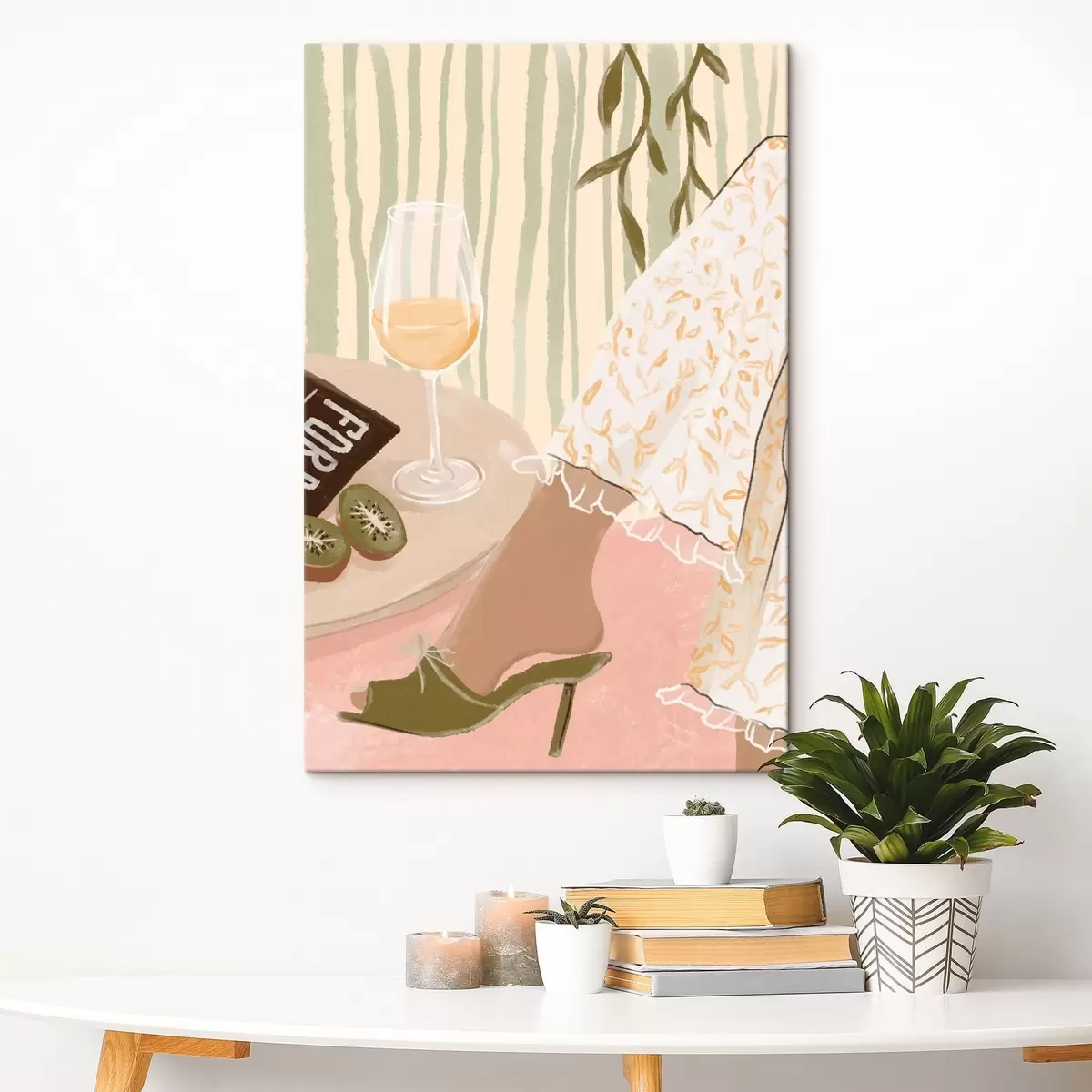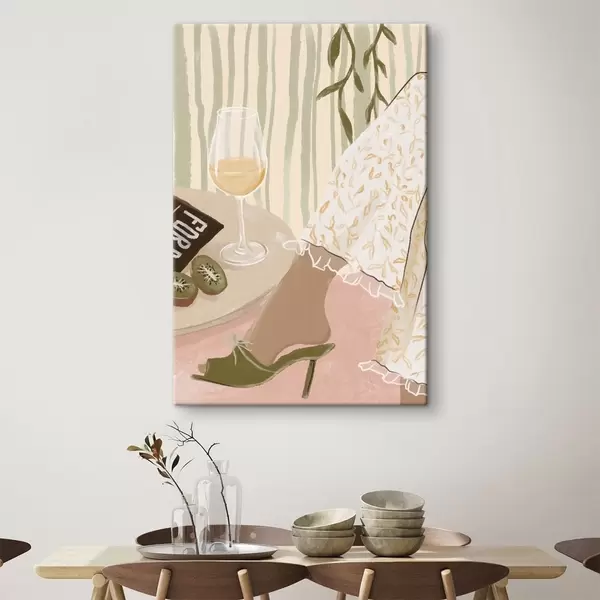 Schilderijen Tafel met wijnglas en kiwi bij jurk s48021