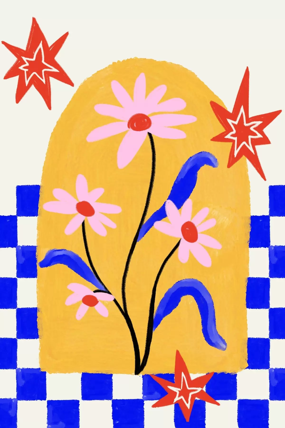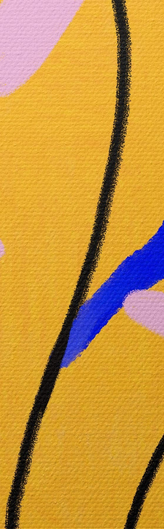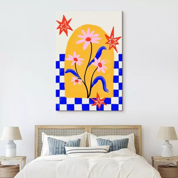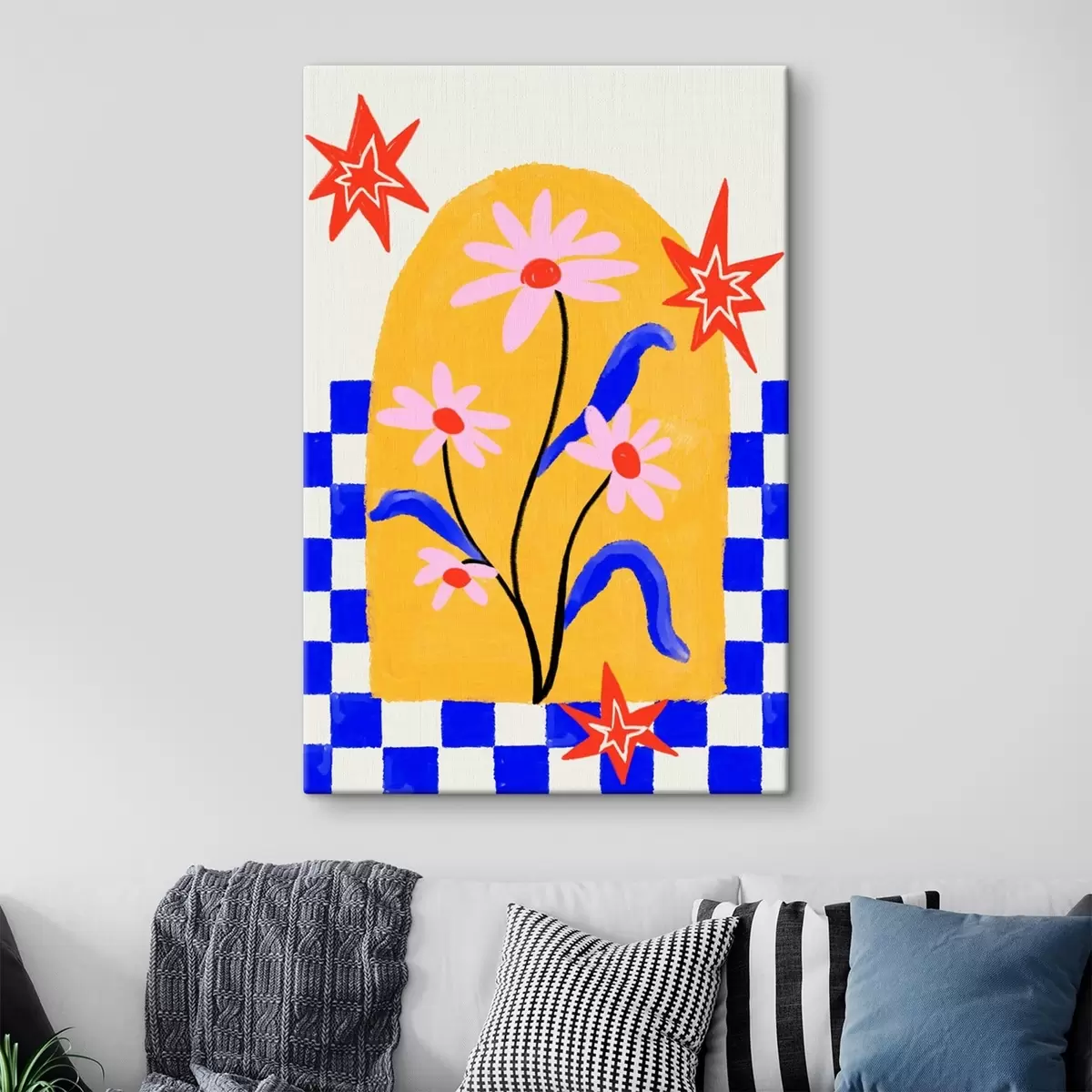Schilderij Felle bloemen op een gele achtergrond met een blauw patroon Art. s48034
