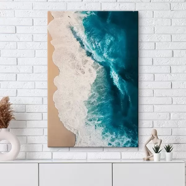 Schilderij luchtfoto van oceaangolven die het zandstrand raken Art. s48062