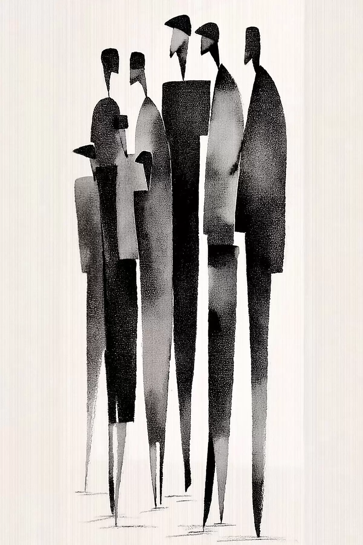 Schilderij minimalistische langgerekte menselijke figuren die in een rij staan Art. s48068