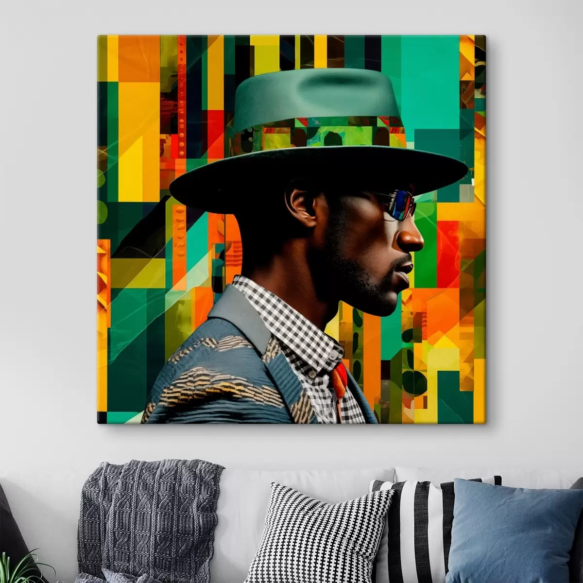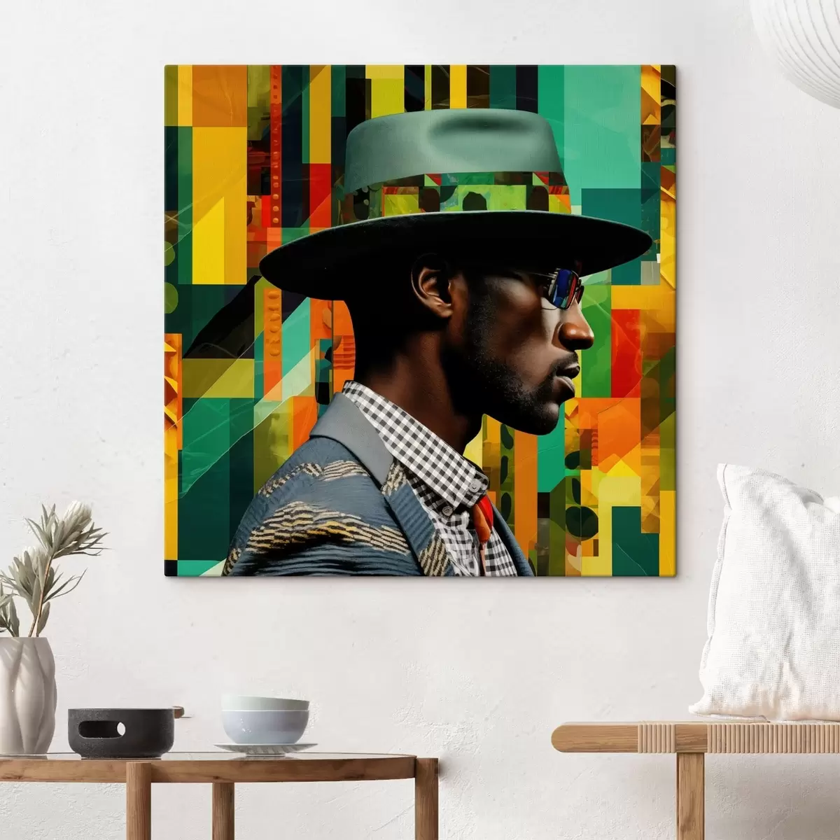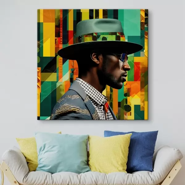 Schilderij Portret van een man met hoed tegen een levendige achtergrond Art. s48100