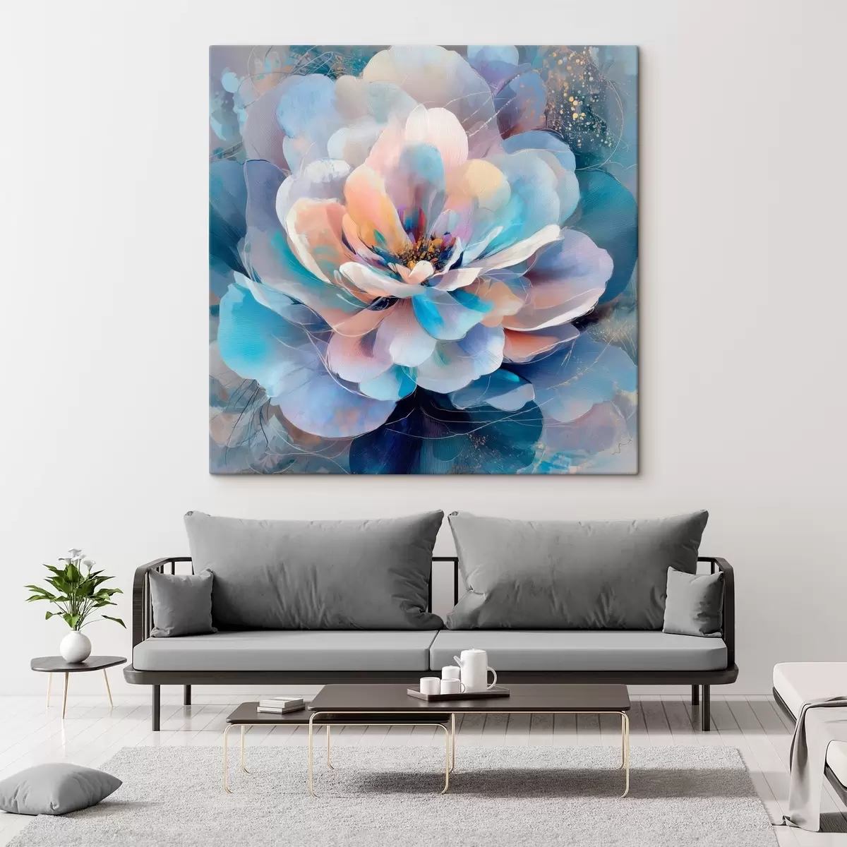 Schilderijen Abstracte bloem in roze en blauwe tinten, uitgevoerd in een eigentijdse schilderstijl s48185
