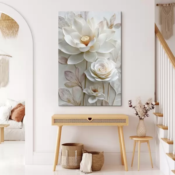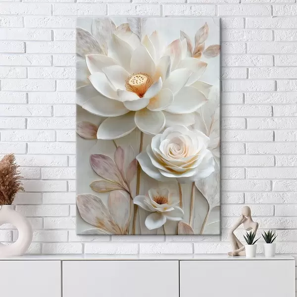 Schilderij Lotus- en rozenbloemen in lichte crèmekleurige tinten in olieverfstijl Art. s48214