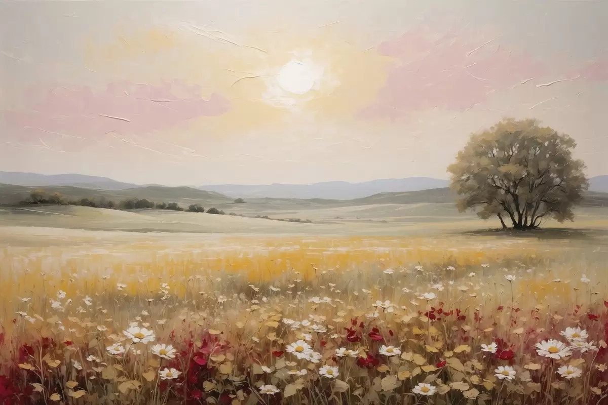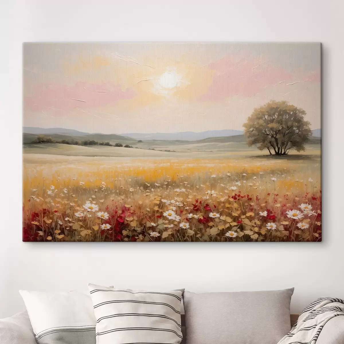 Schilderijen Landschap met een bloemenveld en een boom aan de horizon s48355