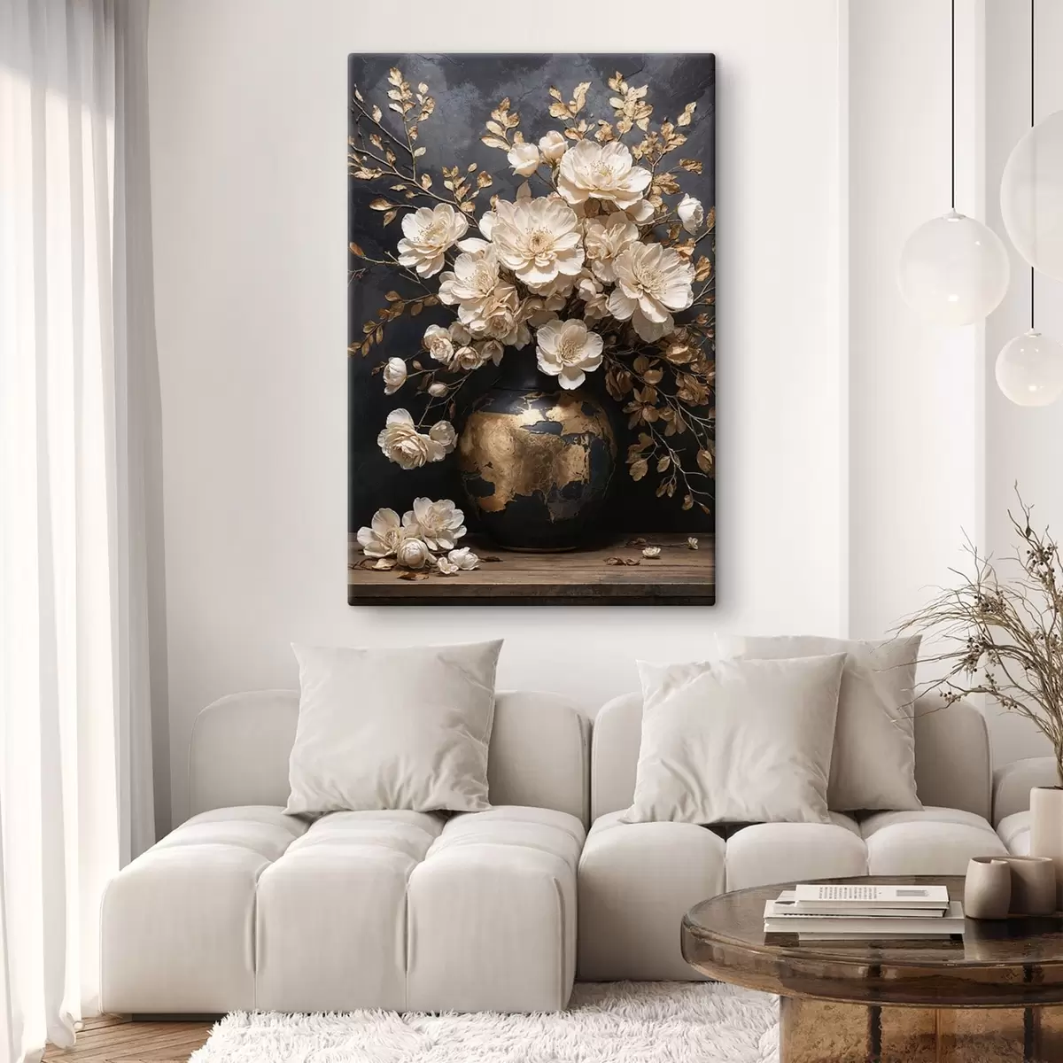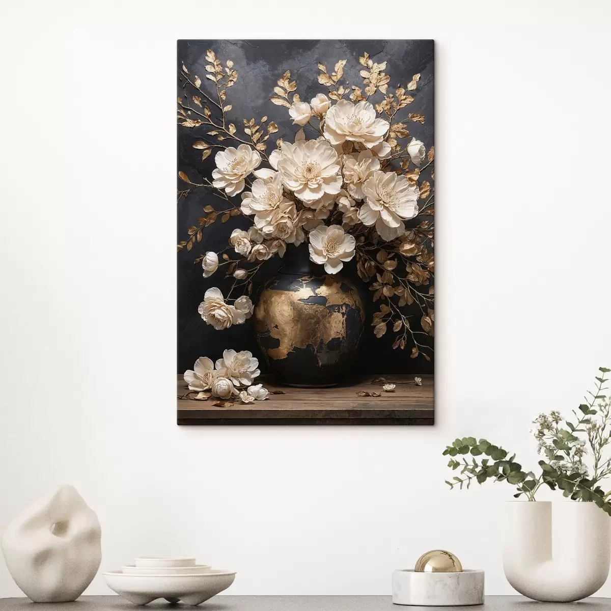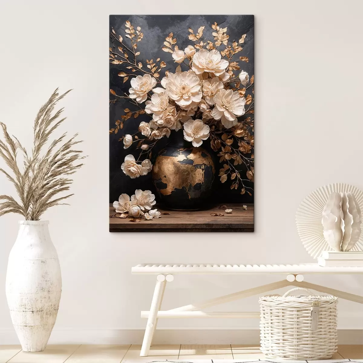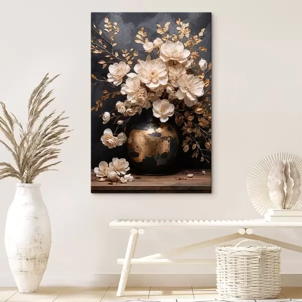 Schilderij Lichte bloemen in een vaas met decoratieve bladeren Art. s48356