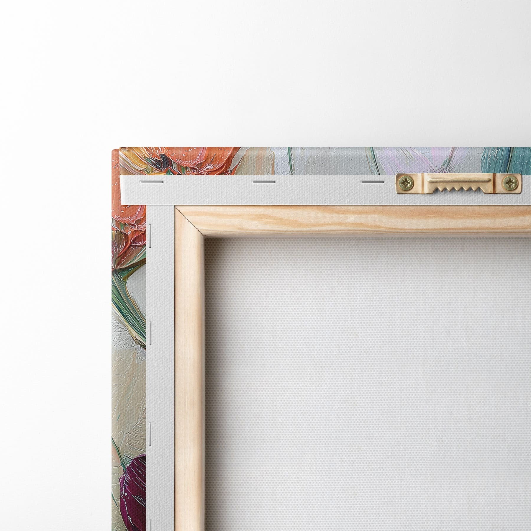 Het schilderij kan direct na ontvangst worden opgehangen. Het schilderij wordt opgespannen op een 2 cm breed houten spieraam.