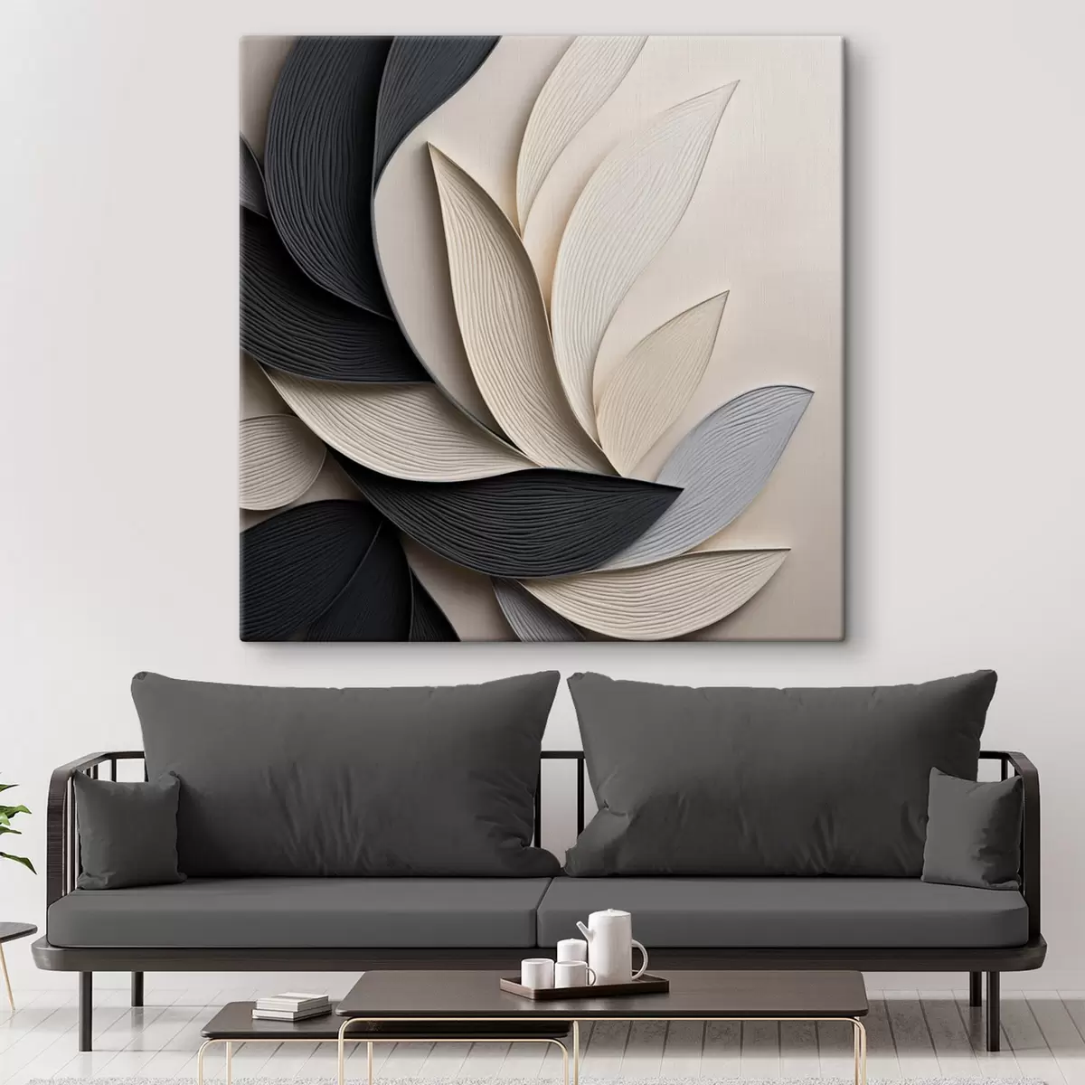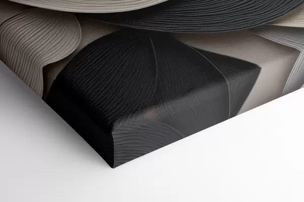 Schilderijen Abstracte compositie van gelaagde bladeren, gebogen vormen in zwart, wit en beige, kunst met textuur s48381