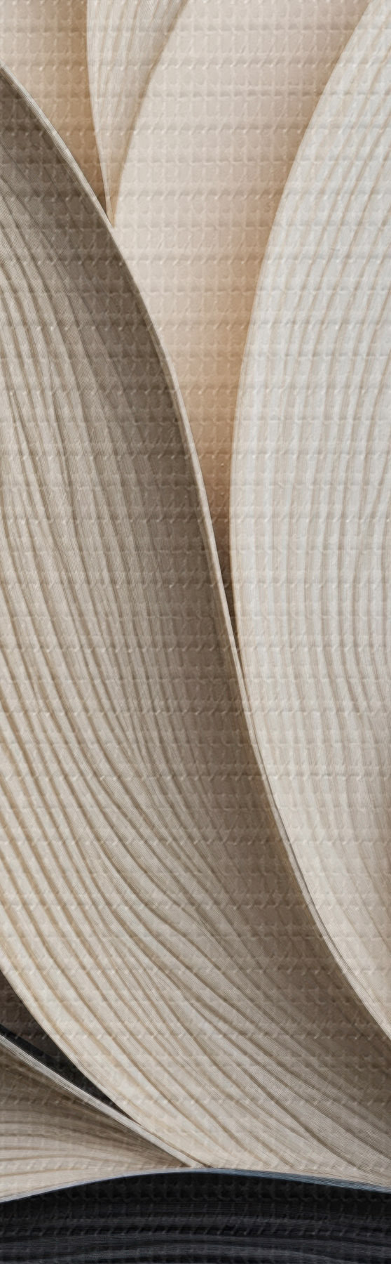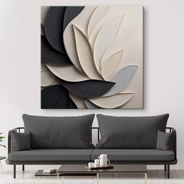 Schilderij Abstracte compositie van gelaagde bladeren, gebogen vormen in zwart, wit en beige, kunst met textuur Art. s48381