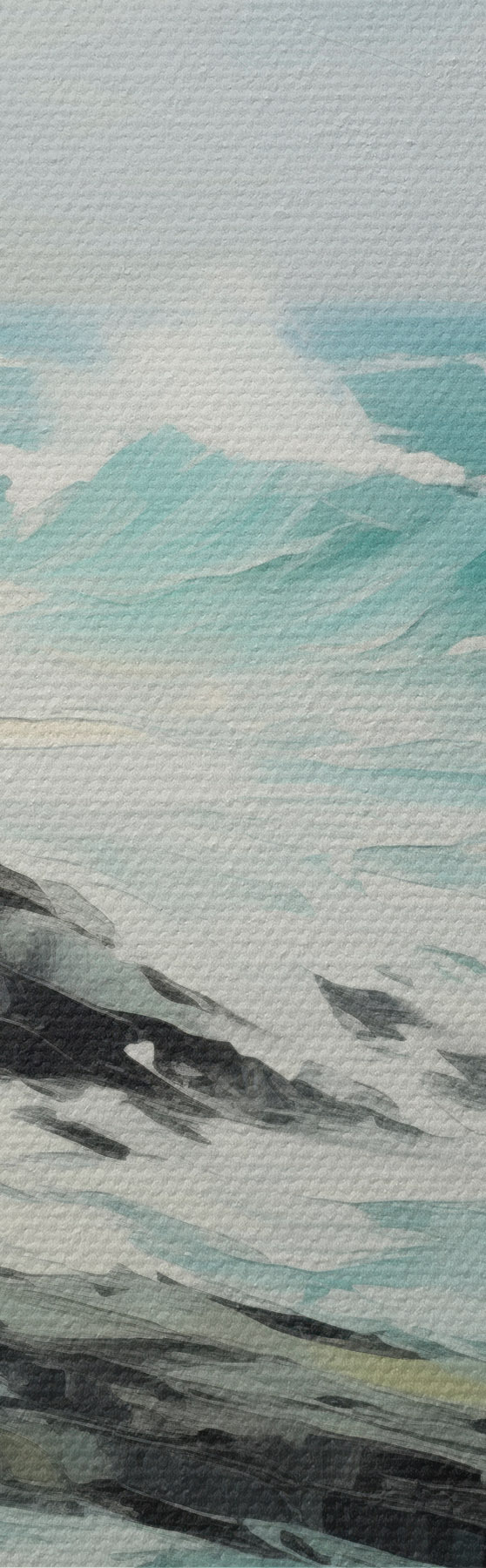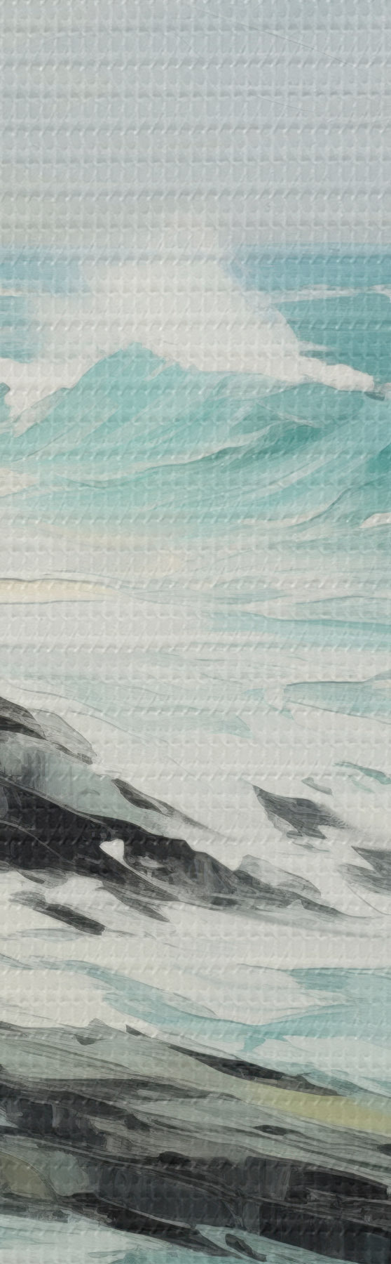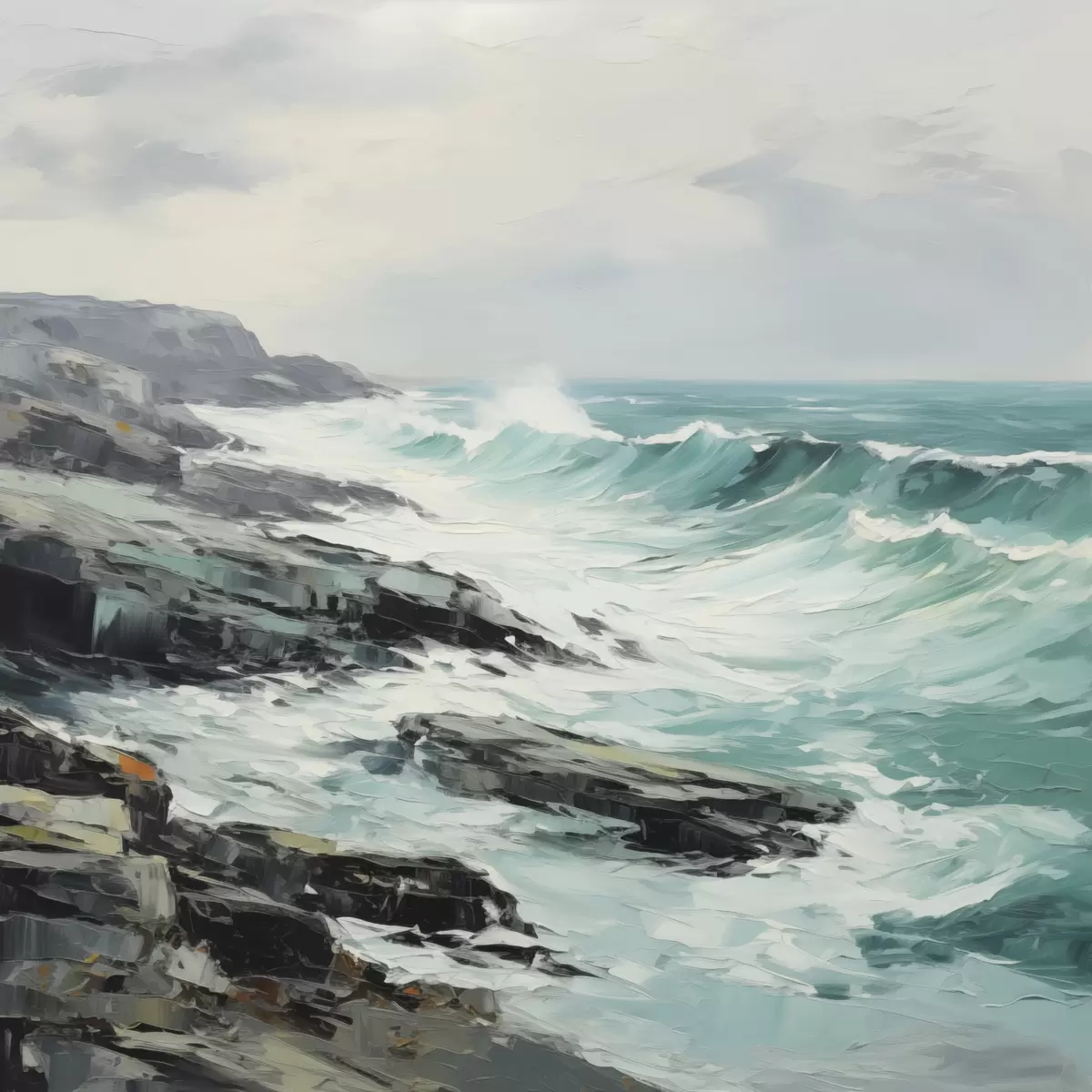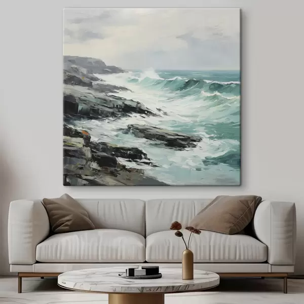 Schilderij Een rotsachtig kustlandschap met golven onder een bewolkte hemel, in schilderijstijl Art. s48387