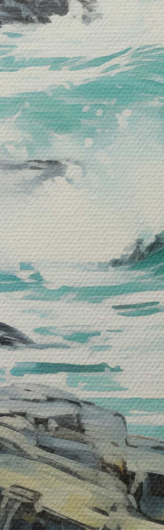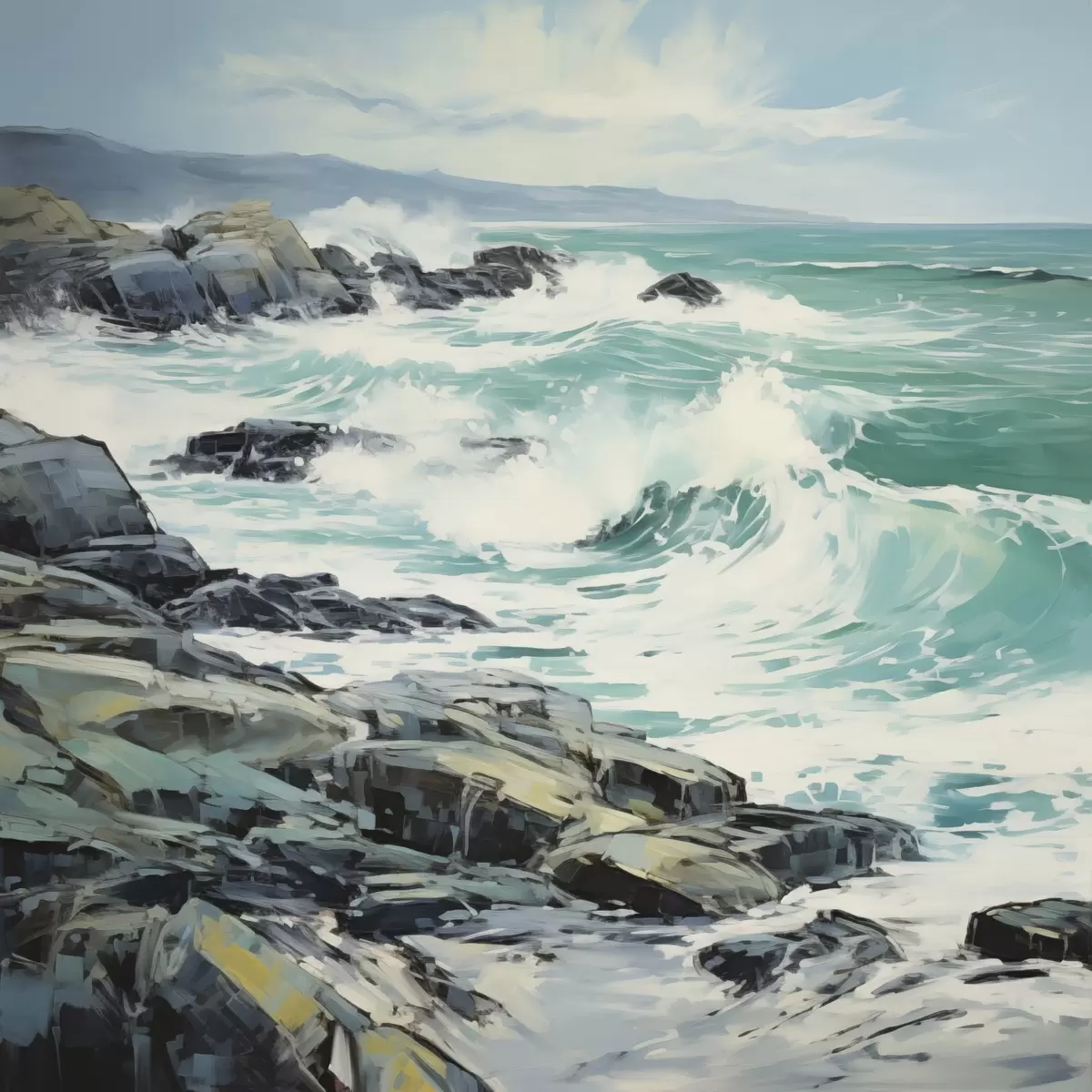 Schilderijen Een rotsachtig kustlandschap met golven onder een bewolkte hemel, in schilderijstijl s48388
