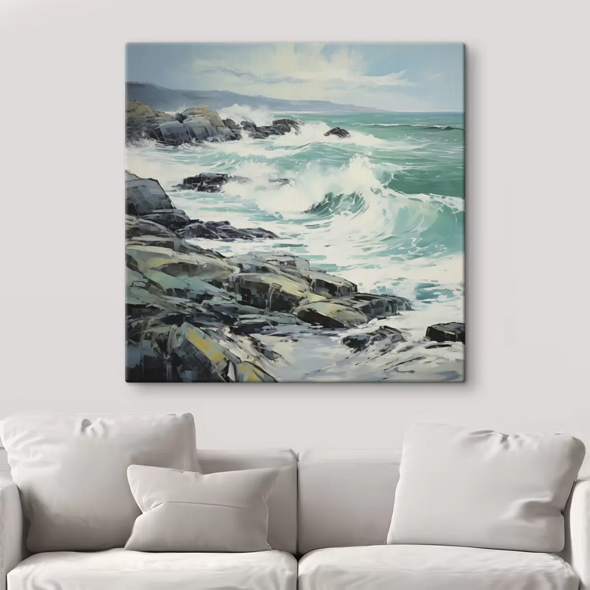 Schilderij Een rotsachtig kustlandschap met golven onder een bewolkte hemel, in schilderijstijl Art. s48388