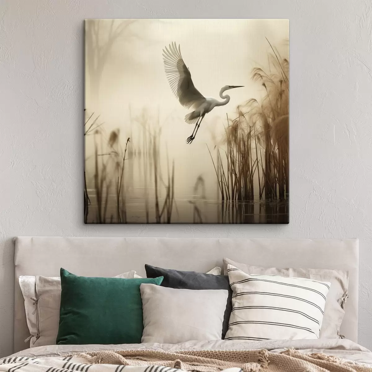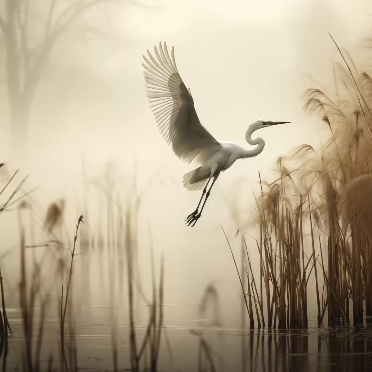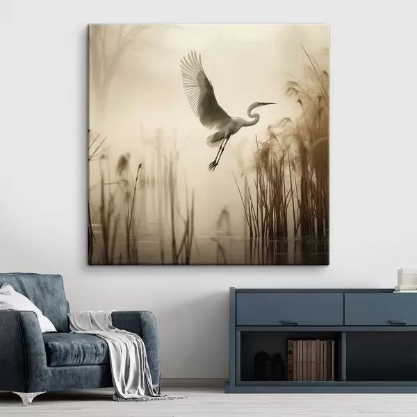 Schilderij Een witte reiger vliegt over een meer, omringd door hoog riet en bomen op de achtergrond Art. s48389