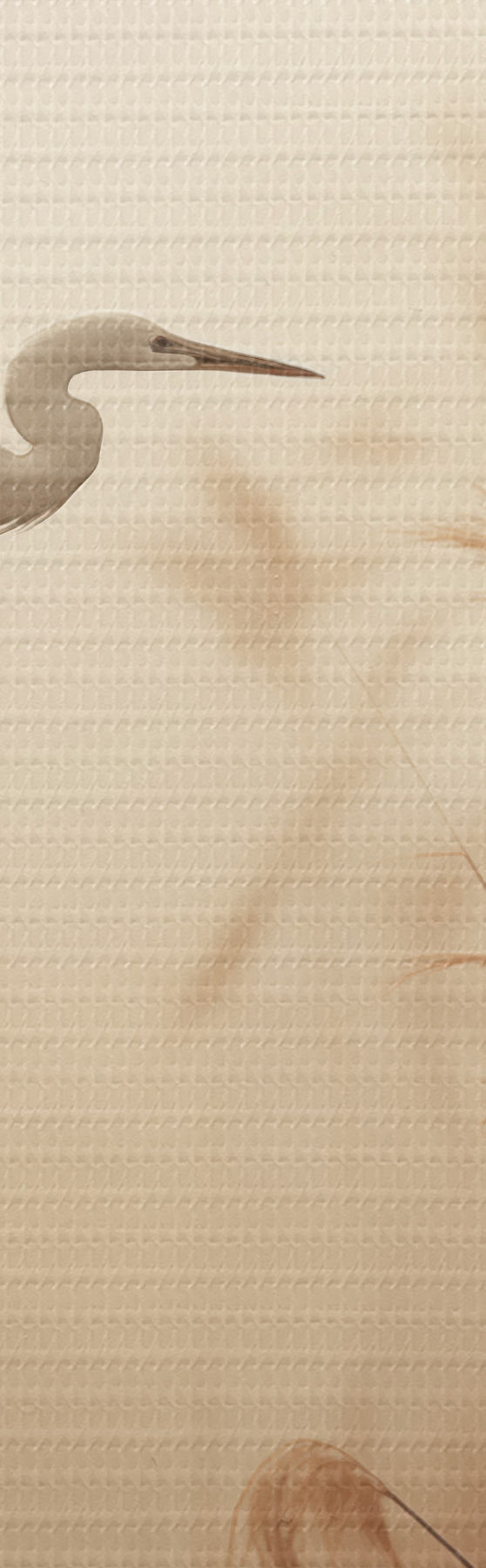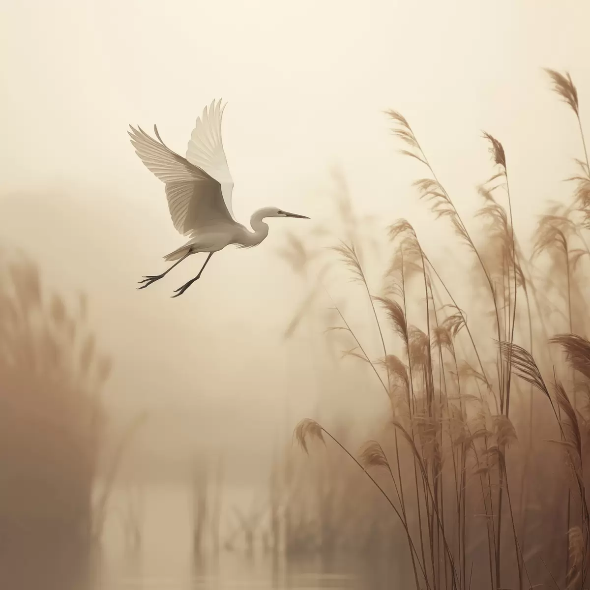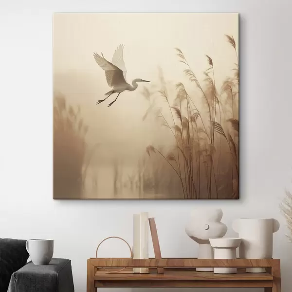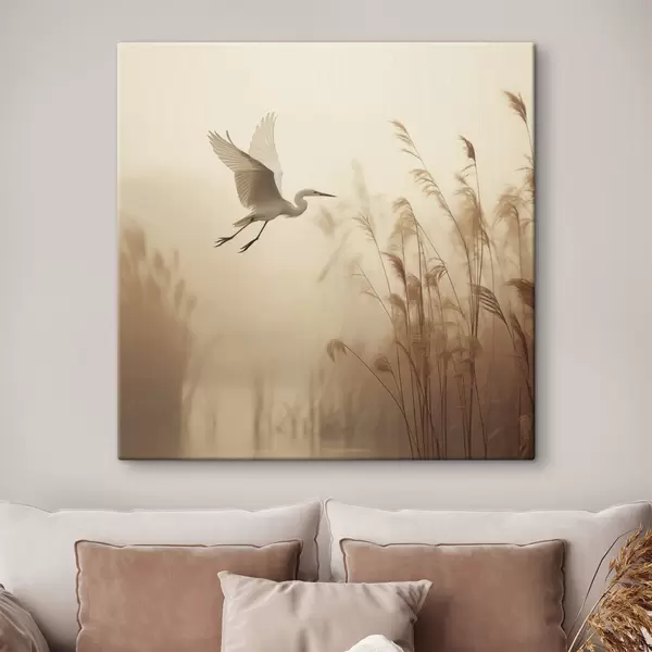 Schilderij Een witte reiger vliegt over een meer, omringd door hoog riet en bomen op de achtergrond Art. s48390