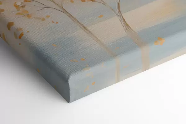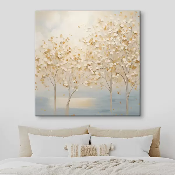 Schilderij Een schilderij met een gestructureerde stijl, waarop bomen met witte en gele bladeren zijn afgebeeld tegen een lichtblauwe achtergrond Art. s48392